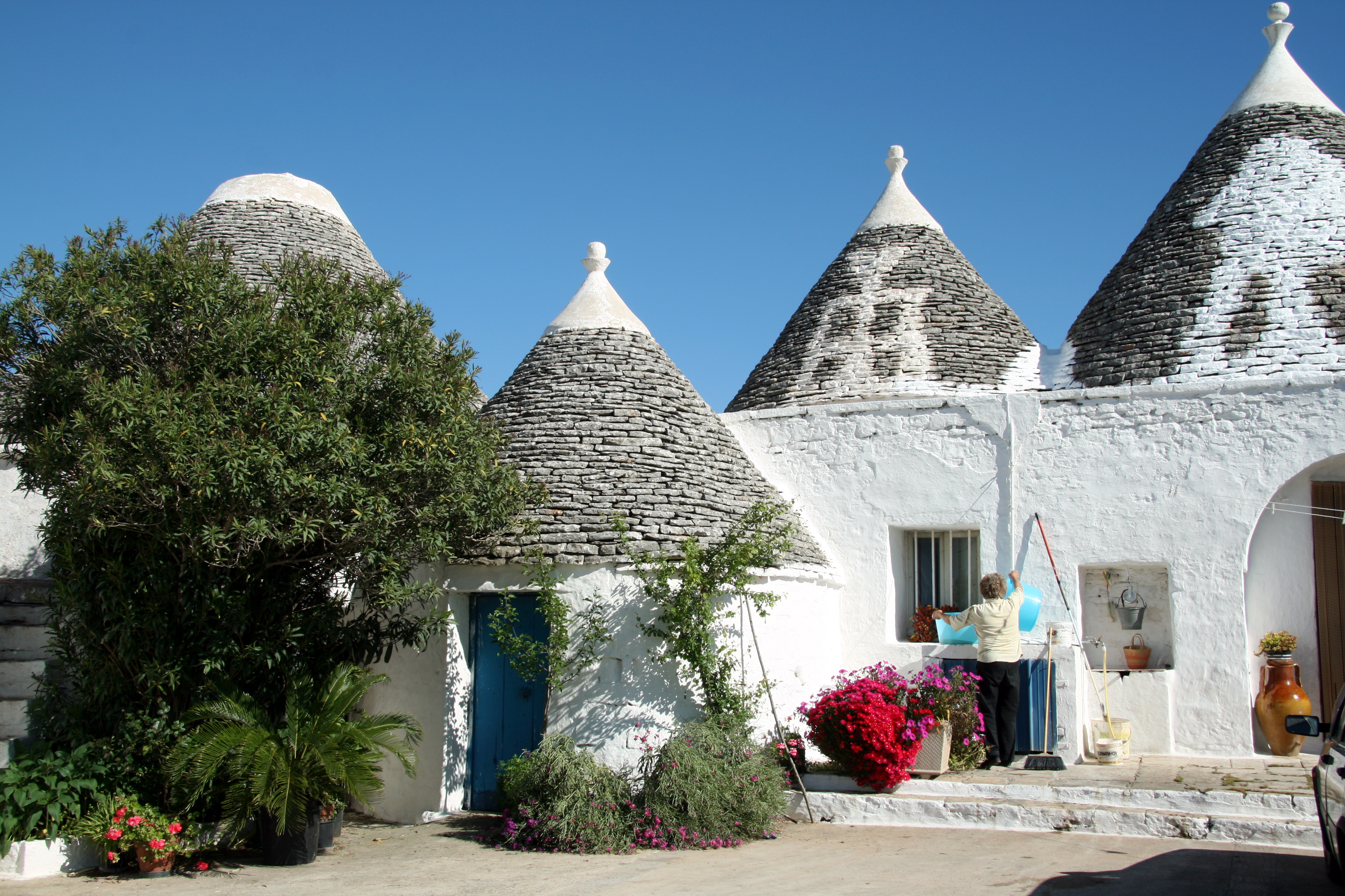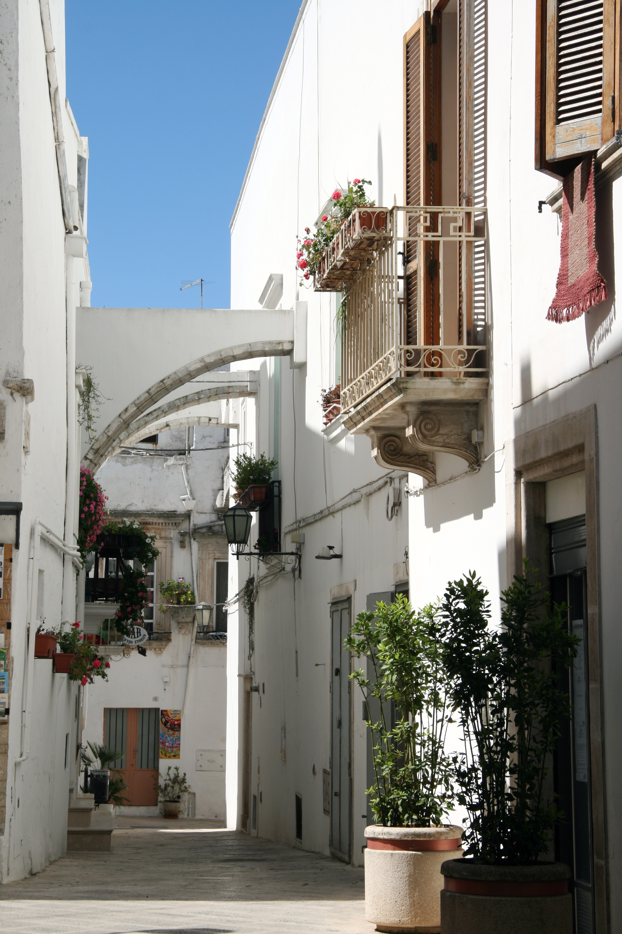De boerin was zo vriendelijk om ons op de binnenplaats te nodigen zodat we mooiere foto’s konden maken, ze liet ons ook een van de schuren van binnen zien zodat je goed kon zien dat deze gebouwen niet gemetseld zijn maar gestapeld. We maken een tussenstop in Locorotondo. De plek waar je campers mag parkeren wordt keurig aangegeven tot het laatste bord dat ons naar rechts verwijst waardoor we op de markt terecht komen. Camper draaien op een klein plekje, een bus voor ons heeft hetzelfde probleem, en de andere kant op. De pijl had naar links moeten wijzen en daar konden we prima staan. Locorotondo is een heel leuk plaatsje. Doet een beetje Grieks aan vanwege de witgekalkte muren.