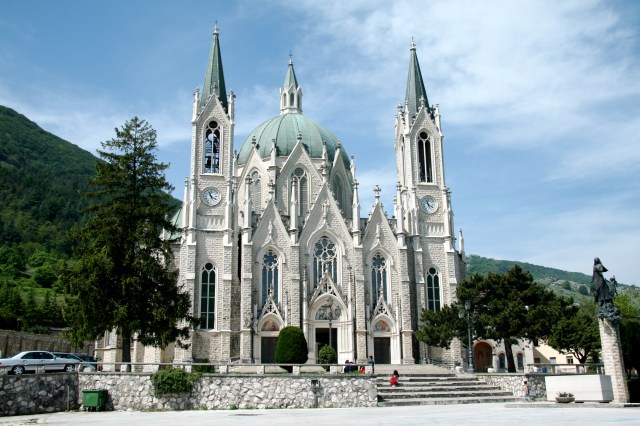Het duurt maar even en we zitten op een mooie weg richting Campobasso en dan verder naar Opi in het hart van Nationaal Park de Abruzzen. Onderweg zien we een kitscherige kerk en we rijden even terug om te kijken wat het is. Even voor Isernia ligt Santo d.Addolorato. We begrijpen er niet veel van, het lijkt een bedevaartsoort.