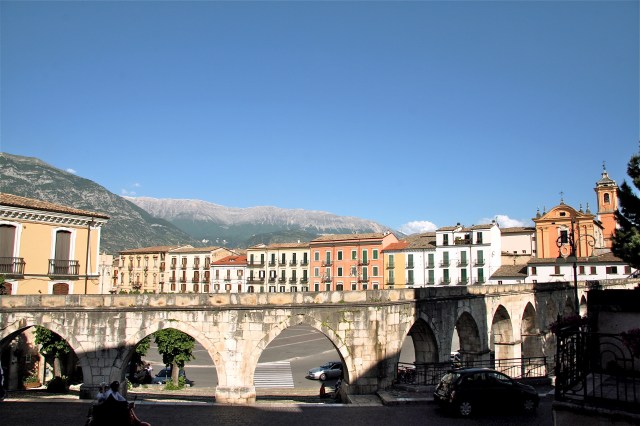 Via een mooie nauwe kloof voert de S479 ons naar Sulmona. De camperplaats ligt vlak bij het oude centrum. Overdag wat verkeerslawaai maar in de nacht was het stil. Om een uur of vier lopen we naar het oude centrum waar het gezellig druk is.