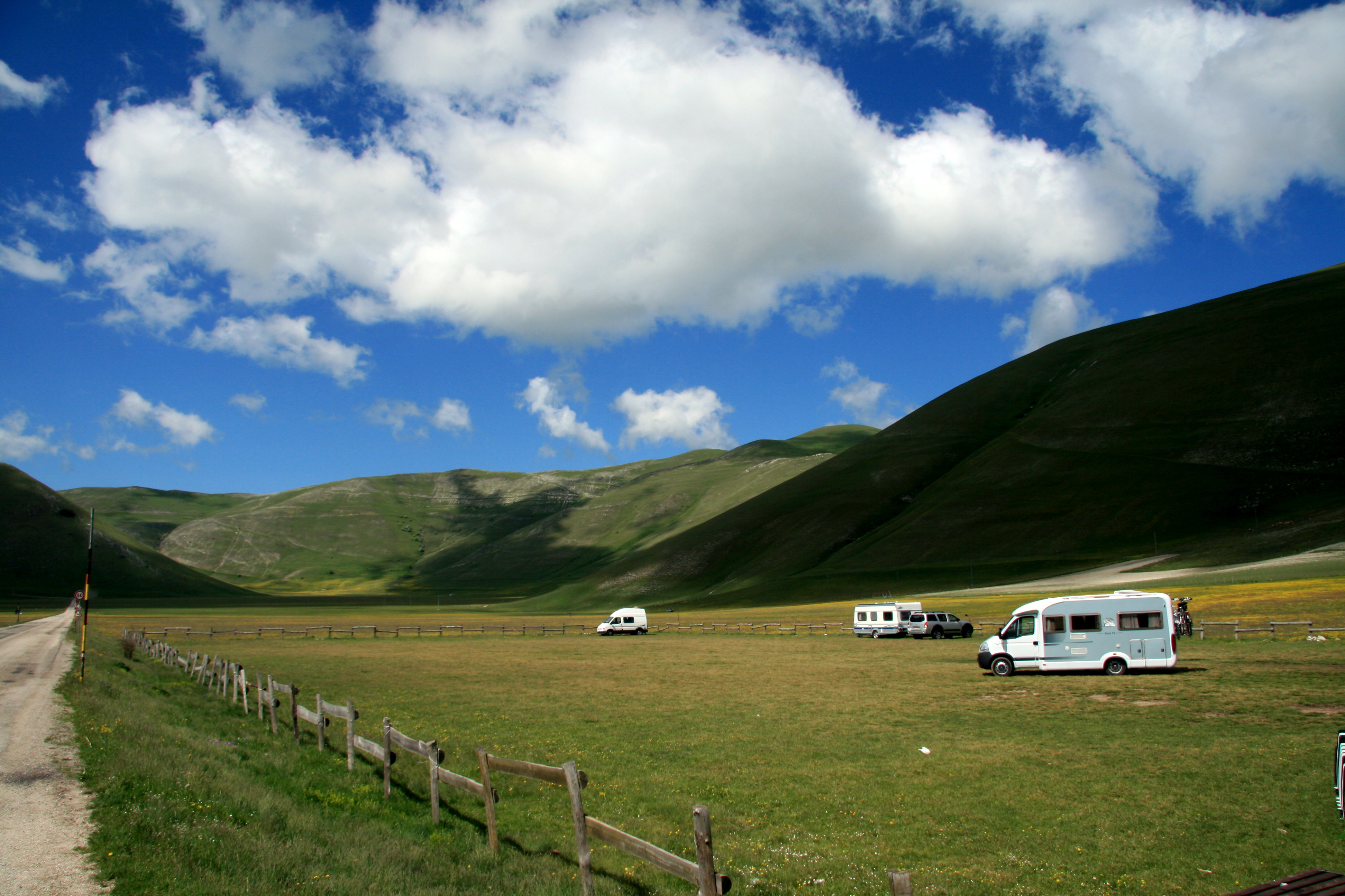 We willen dat pad bij de Refugio wel eens proberen. Lengte 3 km. Maar als we er aankomen hagelt het weer en rijden we maar verder. Dan zien we in de diepte ineens de Piano Grande, een erg mooi gezicht. Castelluccio ligt fier boven op een top. We hebben al zoveel dorpjes gezien. Deze geloven we wel. We slaan links af richting Norcia. Rechts ligt een parkeerplaats waar campers overnacht hebben.