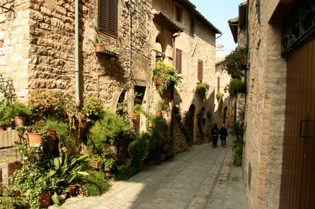Terug naar de S309 zijn we van plan nu eens door te rijden vandaag. We veranderen al snel weer van gedachten. We zijn verbaasd hoe ontzettend veel campers hier rijden. Ik overdrijf niet als ik zeg dat we binnen een half uur zeker 50 campers waren gepasseerd. We stoppen bij Punta Albereto zo’n 35 km boven Ravenna en maken een mooie wandeling door dit natuurgebied. De weg van Ravenna naar Assisie is erg slecht. De glazen rammelen in het keukenkastje. Een wegomlegging van 7 km hoog langs de heuvels kost ons erg veel tijd. In Assisie is het druk op deze Paaszaterdag. Het Fattore Amici adres in Assisi kunnen we niet vinden. Dan maar naar Spello.