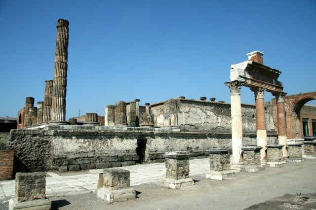 Voor het station moeten we 600 meter omhoog lopen langs een vervelende smalle weg. Met het treintje voor 2,70 euro retour in 20 minuten in Pompei. Ideaal. Pompei is druk. Niet te geloven dat ze zo’n heel dorp onder het lava uit hebben kunnen halen.