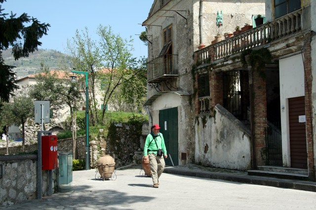 Te voet naar Scanno. Van de parkeerplaats in Lago di Scanno loopt een makkelijk pad naar dit oude plaatsje en dan verder via een weggetje. Scanno is stil zo vroeg in de morgen.
