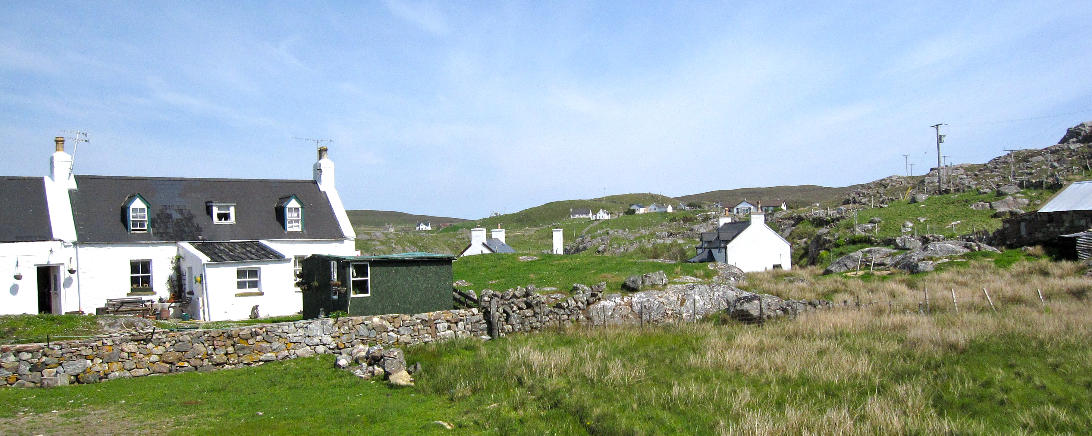 Het is zondag en mooi weer en eigenlijk zouden we gewoon een dagje van de zon moeten genieten. Maar we willen nog veel zien, het is hier zo mooi. Bij Laxford Bridge nemen we de A838 en even later linksaf de B801 naar Sheigra. Al weer zo’n mooie weg met links aftakkingen naar mooie stranden.Bij Sheigra (het pad langs de begraafplaats inrijden) is een “wild camping” plaats. Een hemelse plek. Wij nemen de afslag naar Pollin en wandelen daar een stuk. We hebben uitzicht op Handa en de bergen. Pollin is nauwelijks een dorp te noemen. Hier en daar verspreide huizen in de traditionele stijl. Twee schoorstenen, en drie dakkapellen. Wit gepleisterd. En een prachtig wit zandstrand.
