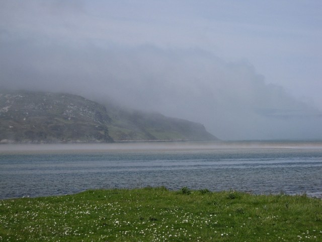 Weer terug op de A838 zien we bij Kyle of Durnes een apart schouwspel. Je ziet het water verdampen en wolken vormen.