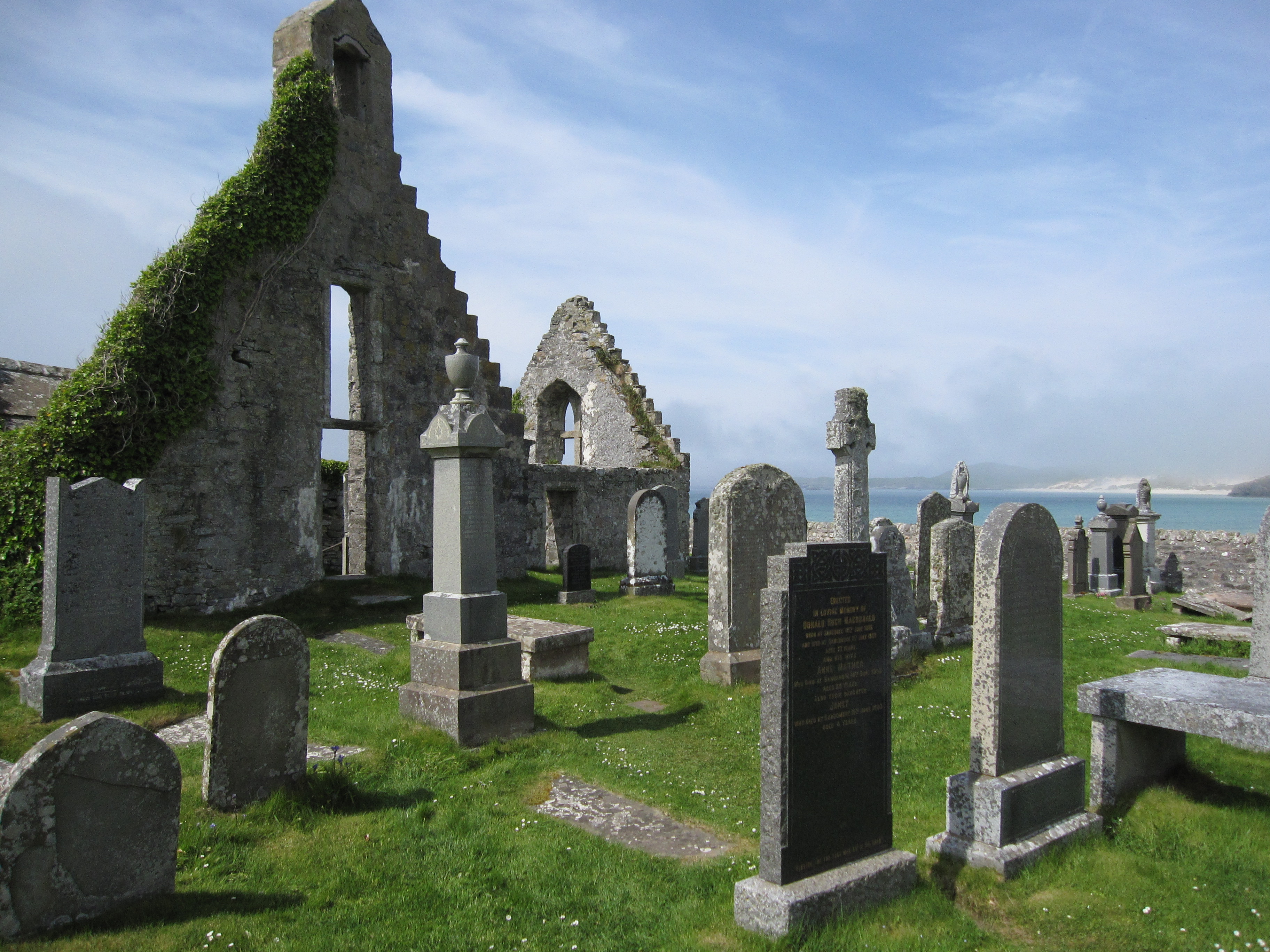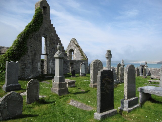 Even voorbij Durness lig bij Balnakeil een oogverblindend wit zandstrand. De wandeling naar Faraid Head is te ver, die slaan we over. We parkeren om het oude ruine kerkje even te bekijken. Die Schotten hadden mooie begraafplaatsen met zeezicht. Het is hier wel veel kouder er staat een straffe zeewind. Helaas krijgen we bij het wegrijden schade aan de camper. Onze Knaus is nogal laag en het wegdek had een hoge rand. Gevolg: achterkant kiept en raakt de grond. Kost ons weer een paar centen.