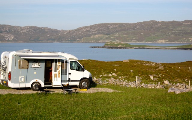 We overnachten op een camping naast de haven van Idrigill en hebben zowaar een beetje zon ’s avonds. Koud blijft het. Alle zomershirts liggen nog ongebuikt in de camperkastjes.