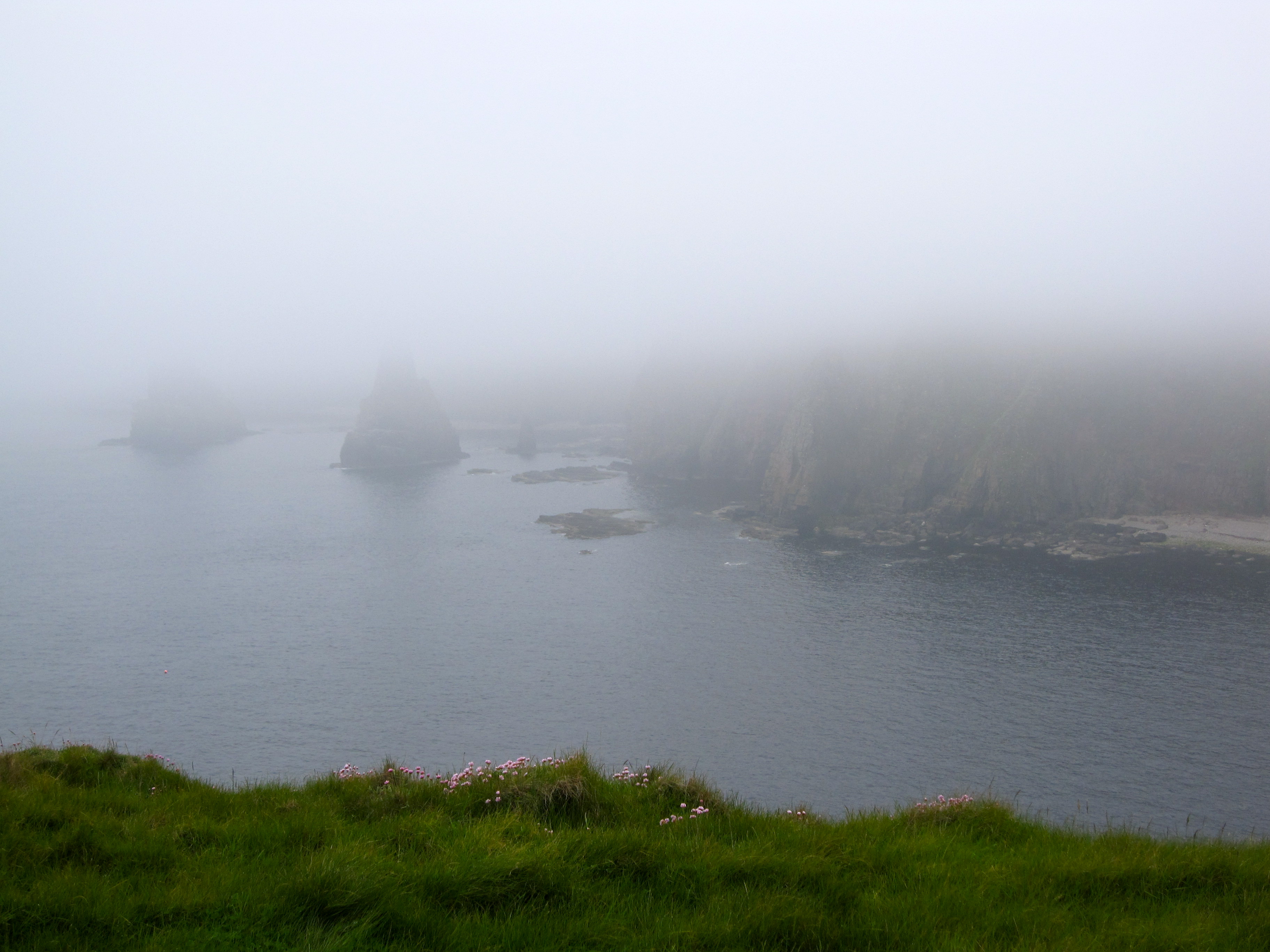 Het wordt steeds kouder. We melden ons op de CL in Scafkerry waar we willen overnachten. De eigenaresse spreekt goed Nederlands. Zij heeft een paar jaar in Rijnsburg gewoond vanwege het werk van haar man. Het wordt steed kouder en dichte mist trekt het land binnen vanaf de zee. Toch willen we nog even naar Duncasby Head. We komen dan eerst langs John o’Groats, de plaats waar de ferry naar de eilanden gaat. De eerste ferry lijn is geopend door de Nederlander. Bij Duncansby Head is het zo koud dat we de warme winterbroek weer aantrekken en toch de wandeling langs de kliffen gaan doen. Dichte mist en straffe wind…..koud!!! Maar weer heel apart en de vogelkolonie is weer indrukwekkend.