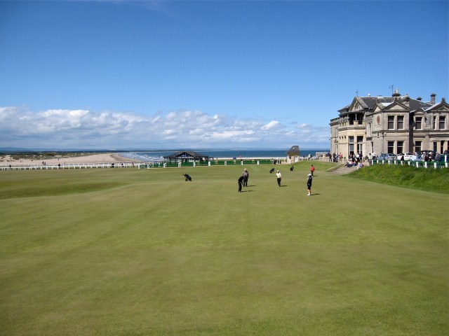 9 juni 2009. Gradus jarig en we maken er een mooi dag van. Het weer werkt mee, er komt al een klein zonnetje door het wolkendek. Eerst naar de Morrisson om inkopen te doen voor een verjaardagmaaltijd. Thuis zou er chocolademousse gekocht worden maar nu moet het sticky toffeepudding zijn. Voor de lunch lekkere broodjes meegenomen. We bezoeken St. Andrew’s. Een gezellige oude plaats en die kathedraal is niet te geloven. Nu een grote ruine maar met een beetje fantasie kan je je wel voorstellen wat een enorm bouwwerk dat geweest moet zijn. Natuurlijk lopen we ook naar ge “Old Course” DE golfbaan van St. Andrews. We staan met plezier een tijd te kijken bij hole 18, het publiek klapt enthousiast als een speler een hele lang put vlak bij de hole neer legt. De meeste spelers lopen met een caddy.