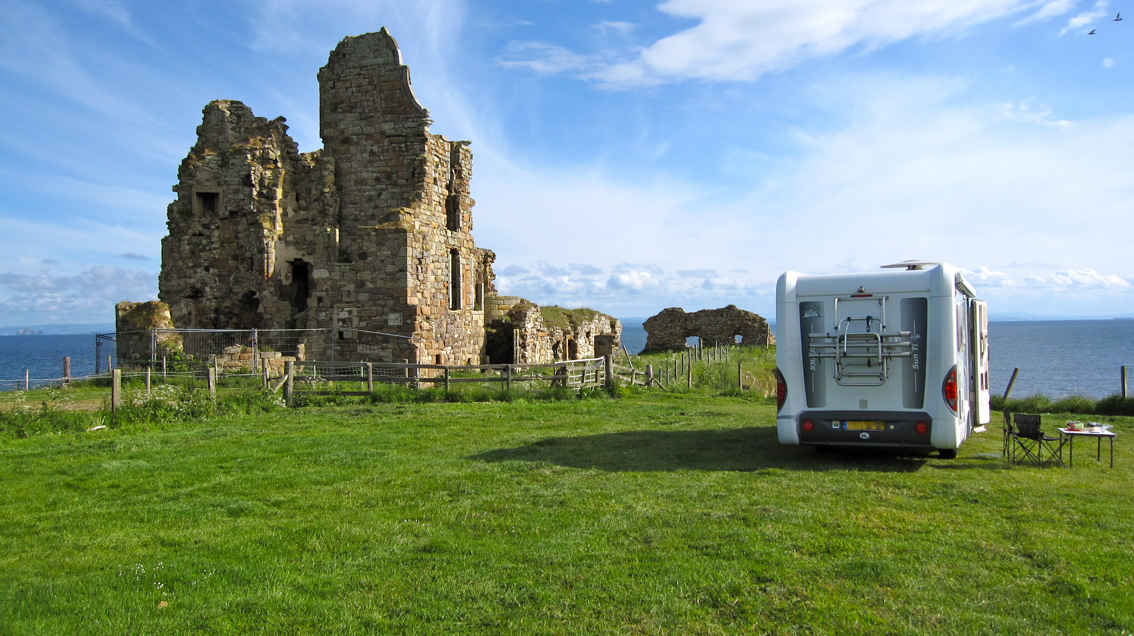 en we overnachten op een Cl bij St. Monans. Nooit gedacht dat hier een CL zou zijn dus in eerste instantie zijn we weer weg gereden. Maar we zaten toch goed. Je moest betalen bij een boederij aan de doorgaande weg en mocht gaan staan aan de kust bij een kasteelruine. Een schitterende plek.