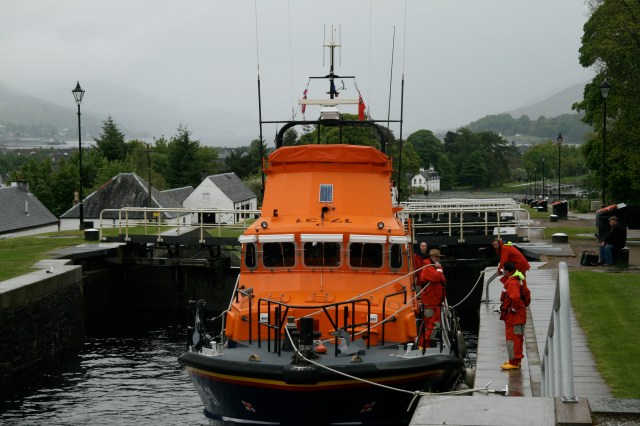 Zaterdag 24 mei. Omdat het droog is maken we eerst maar een wandelingetje naar het dorp. De rest van de dag is het koud (negen graden) veel wind en regen. In Fort William doen we alleen even boodschappen bij de Morrison, hierna rijden we door naar Banavie. Bij deze plaats ligt Neptunes Staircase een sluizencomplex van acht sluizen. In de sluis ligt een reddingsboot die op weg is van Glasgow naar Aberdeen. Vanuit Banavie moet je een mooi uitzicht hebben op de Ben Nevis, maar niet vandaag. De wolken ontnemen ons ieder zicht op de hoogste berg van Schotland.