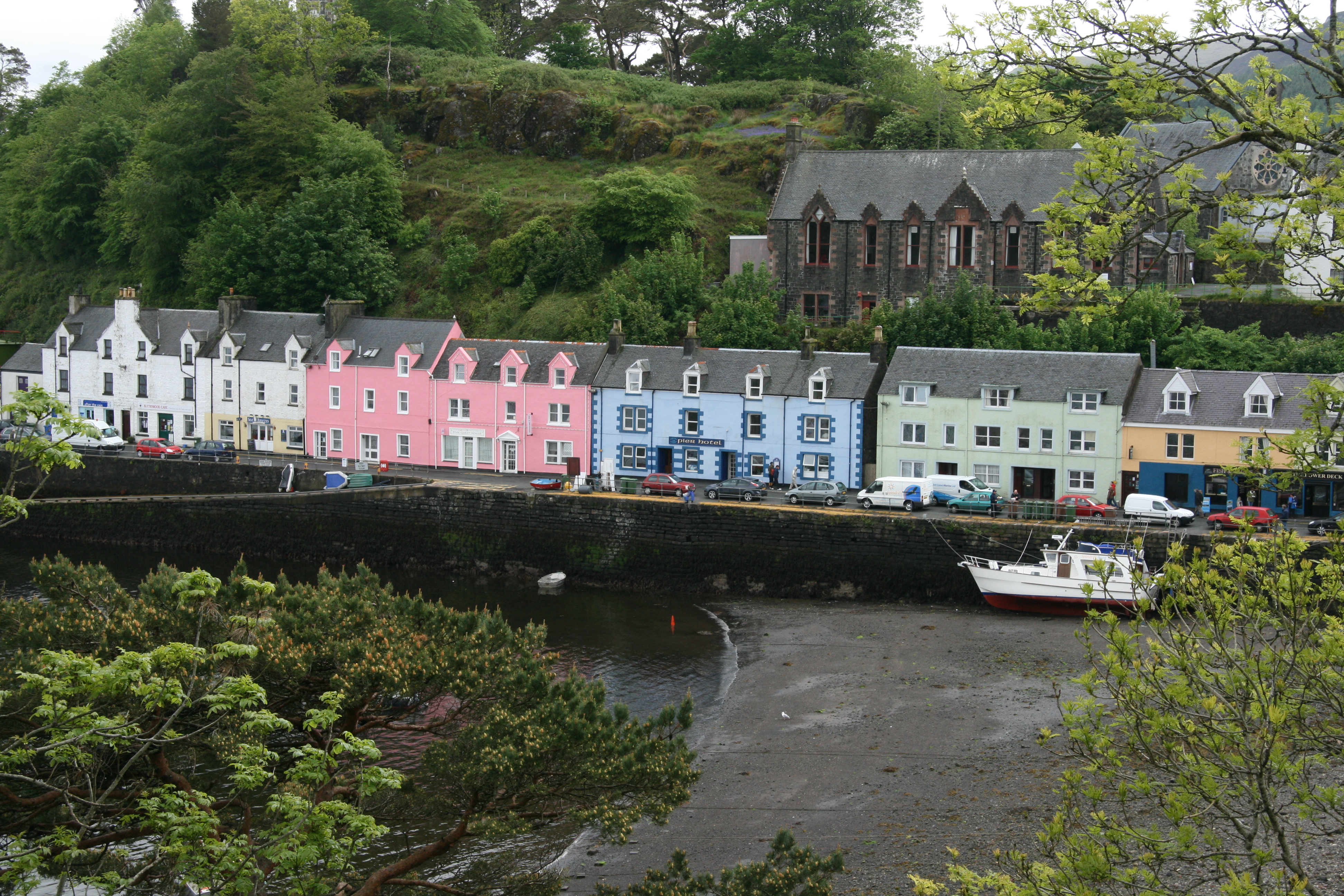 Het wordt eentonig weer regen en wind. Toch viel de dag erg mee, af en toe zon. We gaan weer terug naar de A87 en rijden via Slichachan naar Portree. Portree is een mooi dorp en gezellig druk op deze zondagmorgen. Buiten de haven ligt een groot cruiseschip, de passagiers lopen rond in het plaatsje waar alle winkels open zijn. De huizen die aan de haven staan zijn vrolijk gekleurd. Een welkome afwisseling. De meeste huizen zijn gebouwd van een grijze steensoort.