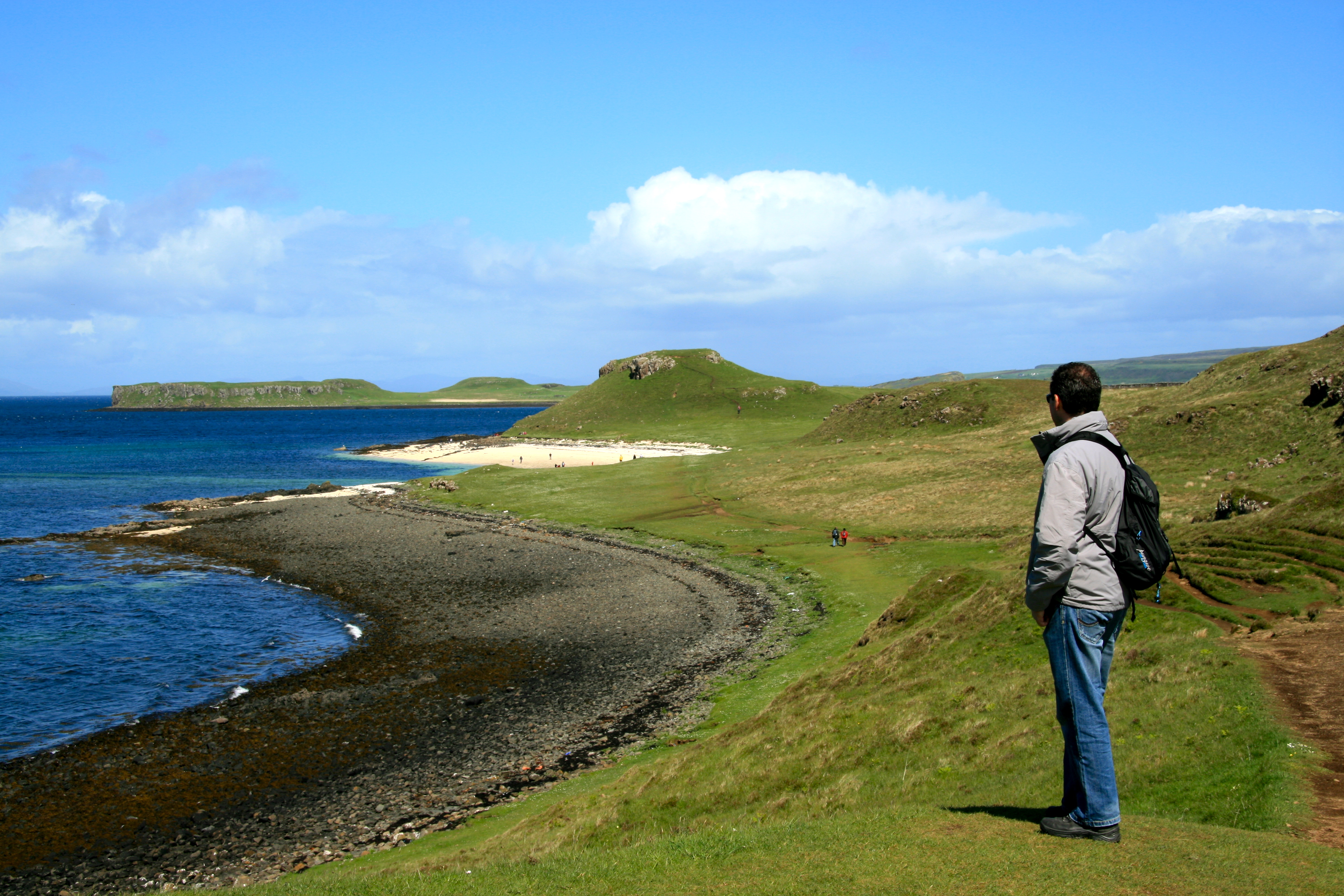 Dinsdag 26 mei begint met regen, eindigt met regen maar daar tussen een “lovely day” zoals een oude dame tegen me zei. We gaan naar Dunvegan, bezoeken niet het kasteel dat tussen de bomen verstopt ligt maar nemen het smalle weggetje langs het water naar Claigan. Hier parkeren we, met veel moeite vanwege de drukte, de camper voor een wandeling. Schitterend!