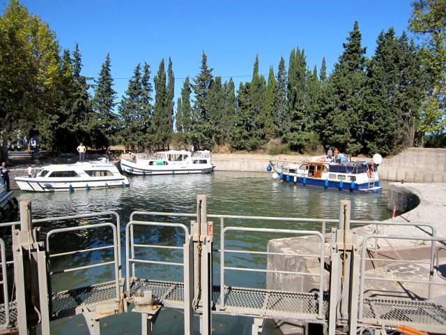 We fietsen langs het kanaal tot aan Beziers en komen verschillende sluizen tegen. Op een moment worden we opgeschrikt door een explosie op een van de boten. Wij zijn maar door gefietst. Je weet maar nooit. In een van de sluizen ook groot spectakel. Een van de boten in de sluis had het touw niet los toen het water in de sluis ging zakken. De voorplecht bleef hoog hangen en dat gaf veel kabaal. Kastjes vlogen open en het serviesgoed vloog door de boot. Al met al een leuk fietstochtje. Achteraf bleek dat we nog verder iets voorbij Beziers hadden moeten fietsen voor de 9 sluizen (neuf ecluses). Die hebben we de volgende dag met de camper bezocht. In het totaal moet hier met behulp van de 9 sluizen 1315 meter hoogte overwonnen worden.