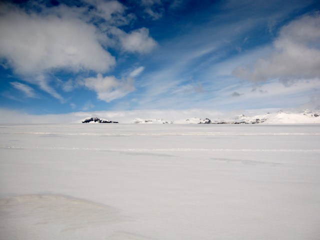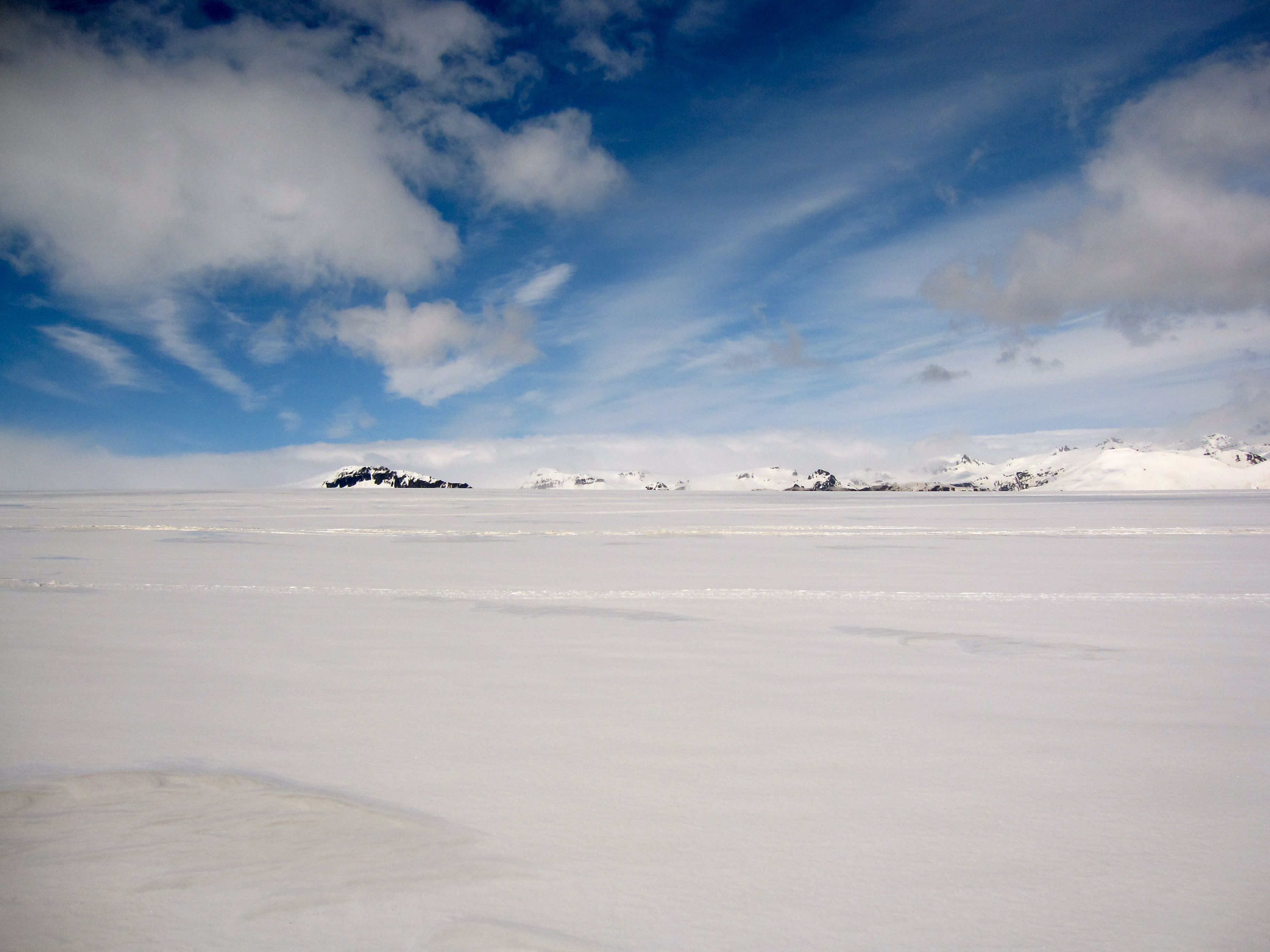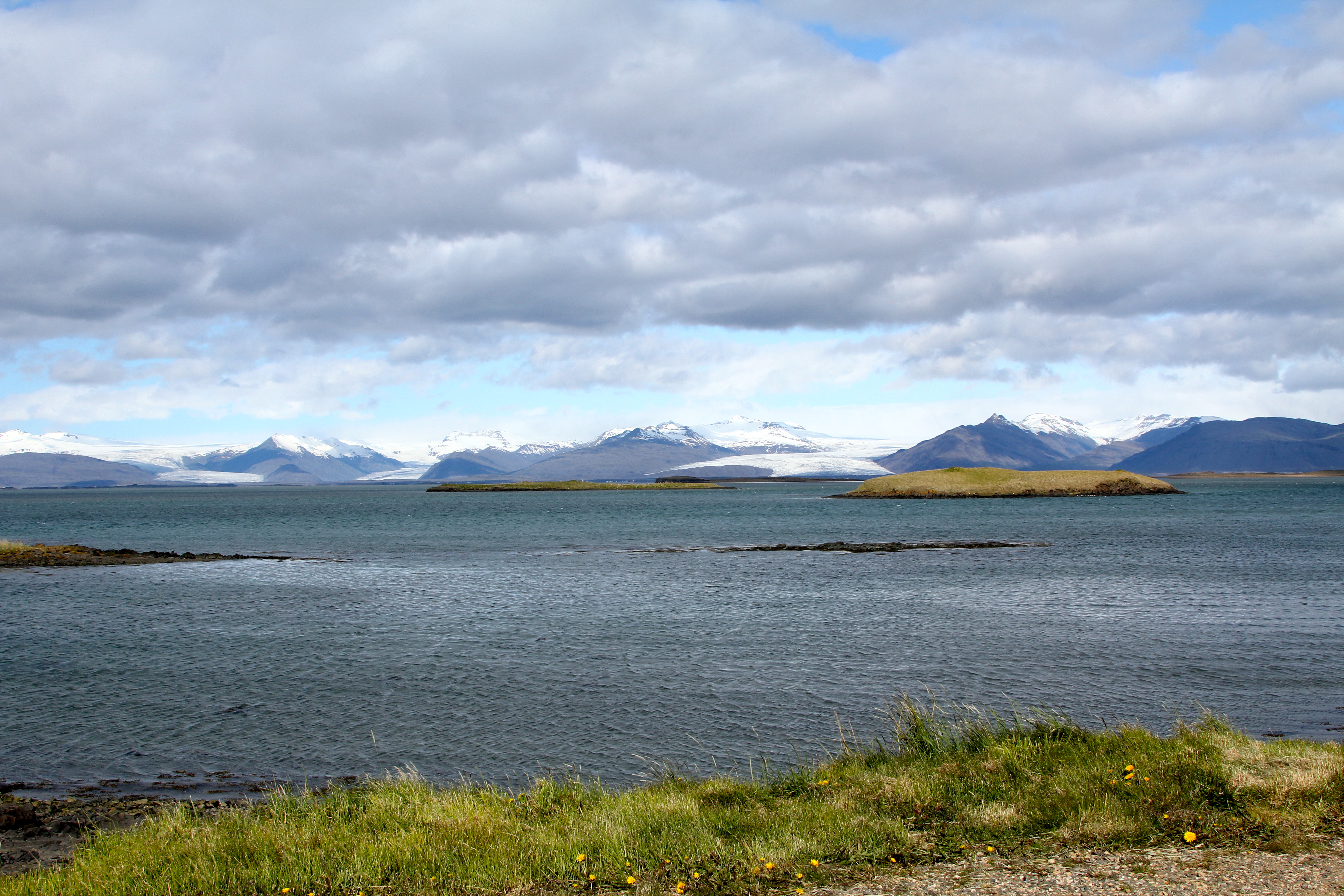 Vanuit de haven Seydisfjördur rijden we meteen omhoog, het is drie graden en er ligt nog veel sneeuw. Even bekruipt mij het gevoel “wat doe ik hier in hemelsnaam”. Maar als we dan in de diepte Egilsstadir zien liggen is dat gevoel meteen weer weg. Dat het koud zou kunnen worden wisten we. Boodschappen gedaan in Egilsstadir en 271 km rijden naar de eerste camping. Gradus had natuurlijk een mooie omweg bedacht. We volgen de 92 en rijden niet door maar gaan naar Reydarfjördur en daar omhoog voor een mooi uitzicht over het fjord. Onderweg zien we veel vogels en eenden waaronder de eidereend en zelfs de harlekijneend. We genieten volop en komen er na drie uur achter dat we pas 75 kilometer hebben gereden en we moeten er nog tweehonderd voor de camping in Höfn: een camping met een niet te schrijven naam . We moesten er nog tegen aan rijden om niet te laat aan te komen. Er viel zo veel te zien onderweg dat we niet erg opschoten. ‘s Avonds om tien uur in Höfn wandelen we langs het fjord en hebben een fenomenaal gezicht over het water op de gletsjers. We zien hier zes uitlopers en de zon die door de wolken piekt geeft steeds een ander beeld. Prachtig! De foto is de volgende dag ‘s morgens gemaakt.