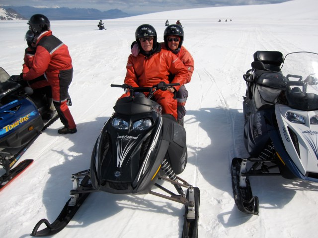 We lopen wel met dikke kleding, het is erg koud. Ook de schoolkindjes die hier wandelen hebben mutsen op, handschoenen aan en een skipak. Het wordt een spannende dag vandaag. Om half elf worden we verwacht bij “Glacierjeeps”. De superjeeps brengen ons moeiteloos naar boven. Aangekomen bij de sneeuw laten ze lucht uit de banden voor het laatste traject naar de hut op de Vatnajökull. We krijgen eerst een zeer smakelijke lunch en dan begint het grote werk. Sneeuwpakken aan, laarzen aan (als je bergschoenen aanhebt was dat ook goed) extra wanten uitzoeken en de scooter op.