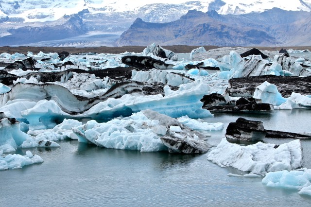 Om twee uur zijn we bij Jökulsarlon, een gletsjerlagune waar we met een amfibievoertuig een tochtje tussen de ijsschotsen maken. Ik was al volmaakt gelukkig met een wandeling rond het meer. Met het amfibievoertuig is koud en nat en ze mogen toch niet dicht bij de gletsjer varen vanwege de veiligheid. Maar met minder koud weer en zon zal het veel mooier zijn.