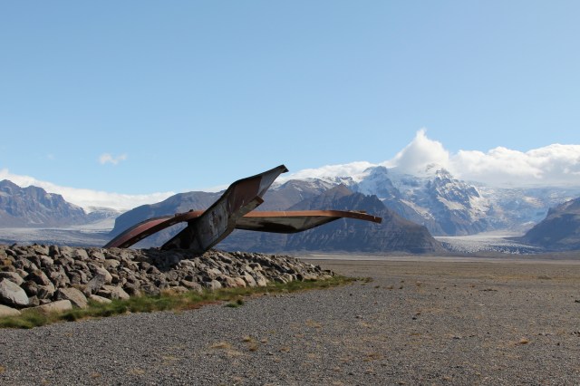 We worden wakker met stralend weer en het beloofd een prachtige dag te worden. Op de camping heb je bijna de neiging om buiten te ontbijten maar voor IJsland is dat dat toch een beetje te optimistisch. Hoe uitnodigend het weer er ook uitziet, de koude wind maakt dat we toch maar in de camper ontbijten. Onze eerste stop is bij het monument met informatie over de “Jökullhlaup”van 1996. Hier staat een kunstwerk gemaakt van de resten van de toen meegesleurde brug.