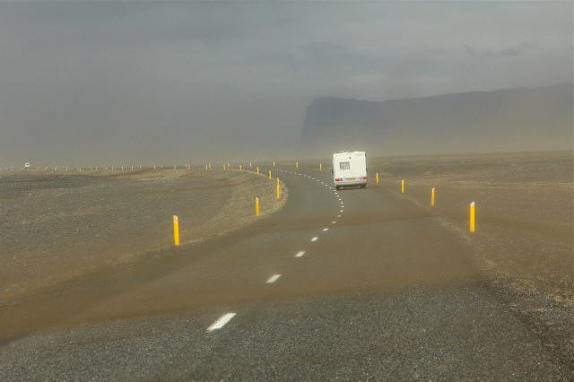 En voor we het ons realiseren zitten we midden in een as storm. We rijden door een grote spoelzandvlakte van duizend vierkante kilometer: Skeiđarársandur. Op zo’n moment vraag je je vertwijfeld af “waarom wonen hier mensen?” Dit eiland is niet gemaakt voor bewoning. Dit traject was zeker 35 kilometer.