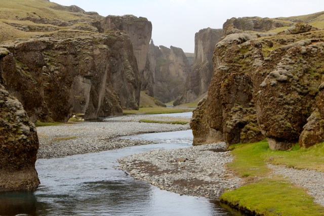 Een lavaveld ontstaan in 1783 en het gevolg van een zeven maanden durende uitbarsting van de Lakagigar. En zo groot dat het een half procent van de totale oppervlake van IJsland beslaat. De lava lijkt overgoten door een dikke witte saus. Op andere foto’s heb ik gezien dat het mos later in het seizoen wel groen kleurt. We nemen voor Vik de afslag van de 206 naar de Fjabrárglúfur, een lange kloof. Je kunt een heel eind langs de kloof lopen, wat wij doen tot de waterval.