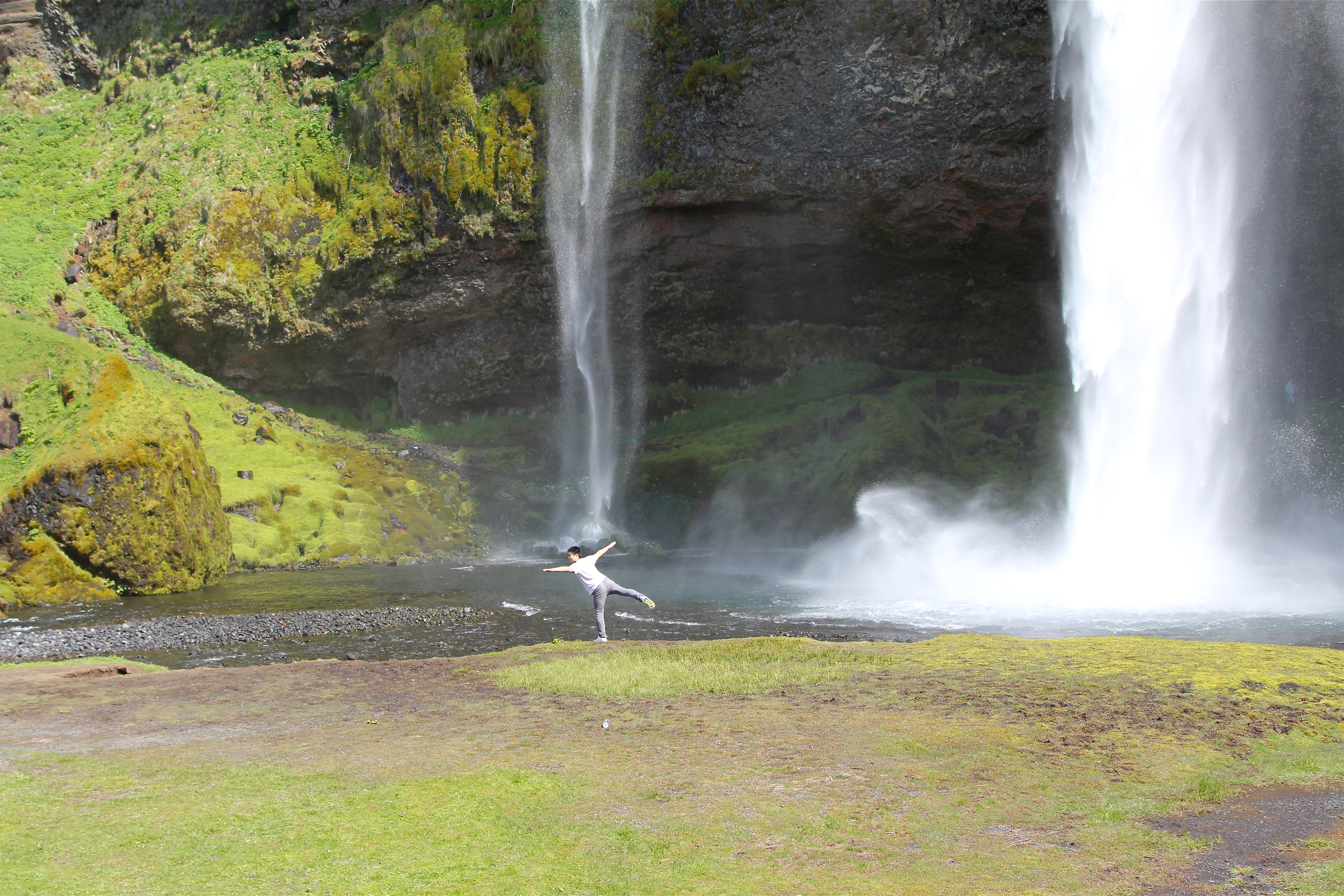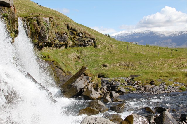 Nog weer verder langs de een (wel naar rechts afslaan) ligt de Seljalandfoss ook weer zo’n mooie waterval. Je kan achter de waterval langs lopen maar riskeert natuurlijk wel een nat pak. Het was deze dag mooi weer en niet veel wind, dus veel bezoekers namen de uitdaging aan. Als je op de foto goed kijkt zie je helemaal rechts een meneer in het blauw lopen.