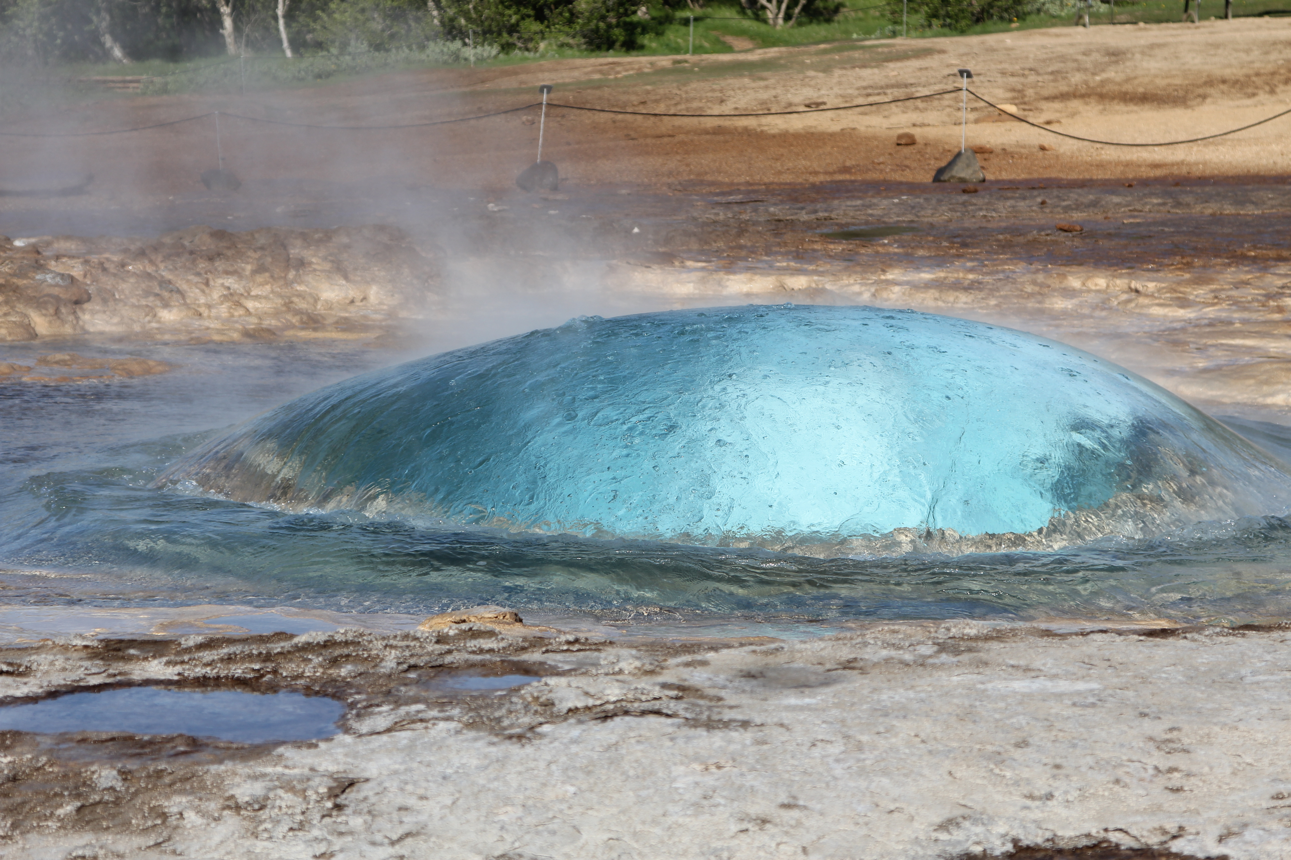 En dan komen we bij Geysir waar de Strokkur met grote regelmaat een flinke spuit van twintig meter en meer de lucht in spuwt. Enorm fascinerend om te zien. Het water is eerst rustig, begint dan te dansen en van links naar recht te bewegen en je hoort de mensen die toekijken hun adem inhouden. Soms roept er iemand “there he goes” maar de geiser lijkt een spelletje met ons te spelen. Het water wordt weer rustig en dan opeens…….een flinke bel van grijs naar donkerblauw naar felblauw, dat alles in een fractie van een seconde en daar gaat ie dan.