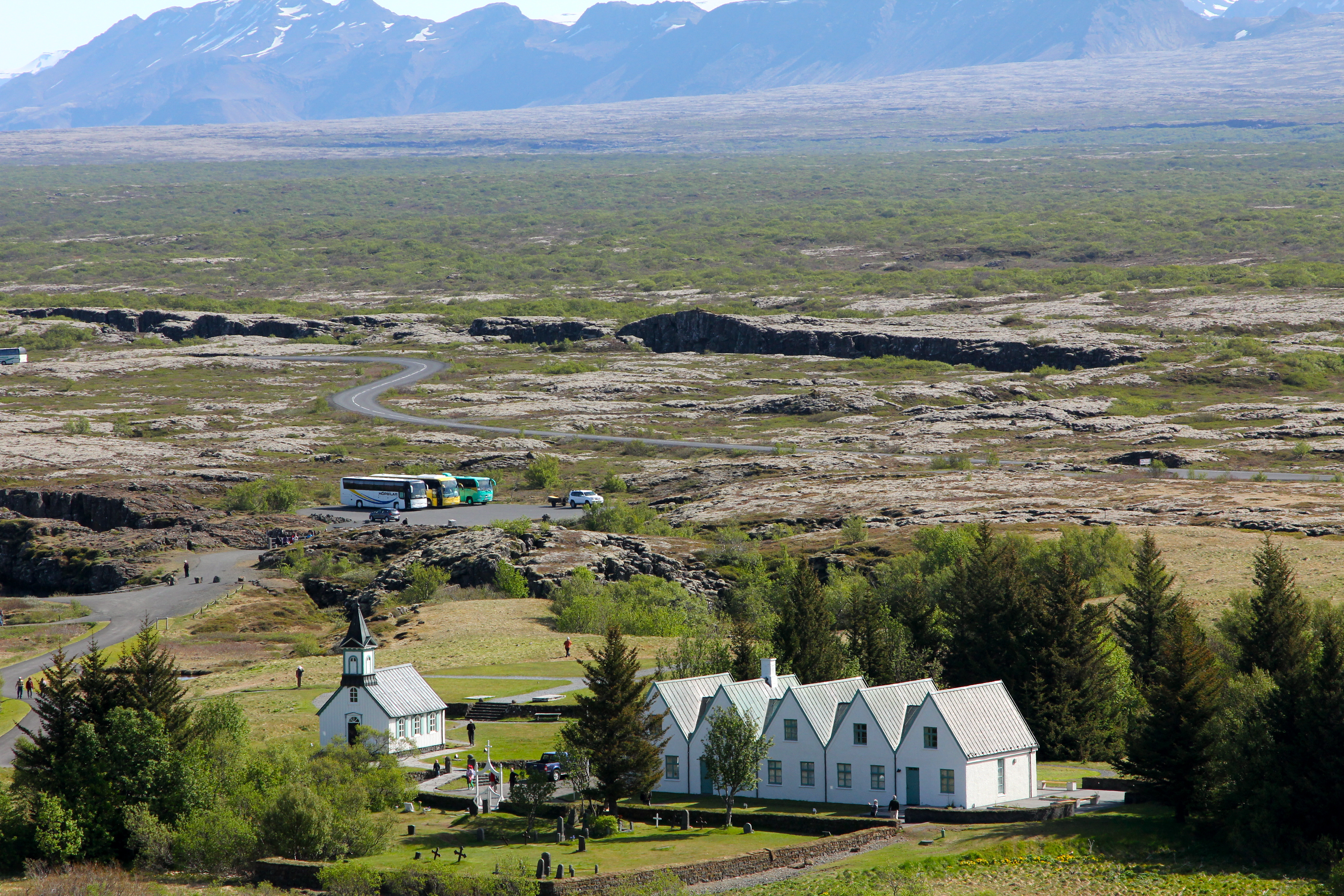 Wij gaan vroeg op pad naar Reykjavik maar niet zonder eerst nog een bezoek te brengen aan Pingvellir: het Nationale heiligdom van IJsland. Hier ligt de geologische grens tussen het Noord-Amerikaanse en Europese continentaal plat. De platen verzakken en drijven jaarlijks 2 centimeter uit elkaar. Ook historisch is dit een gewichtige plek. Op 17 juni 1944 werd hier de onafhankelijkheid getekend. Vanaf 930 kwam men hier al bij elkaar voor het bespreken van belangrijke zaken. Dat noemt met een Alþing.Het was druk op deze belangrijke plek, we zaten dan ook dicht bij 17 juni de Nationale Feestdag van IJsland. Veel bussen met waarschijnlijk dagtoeristen uit Reykjavik.