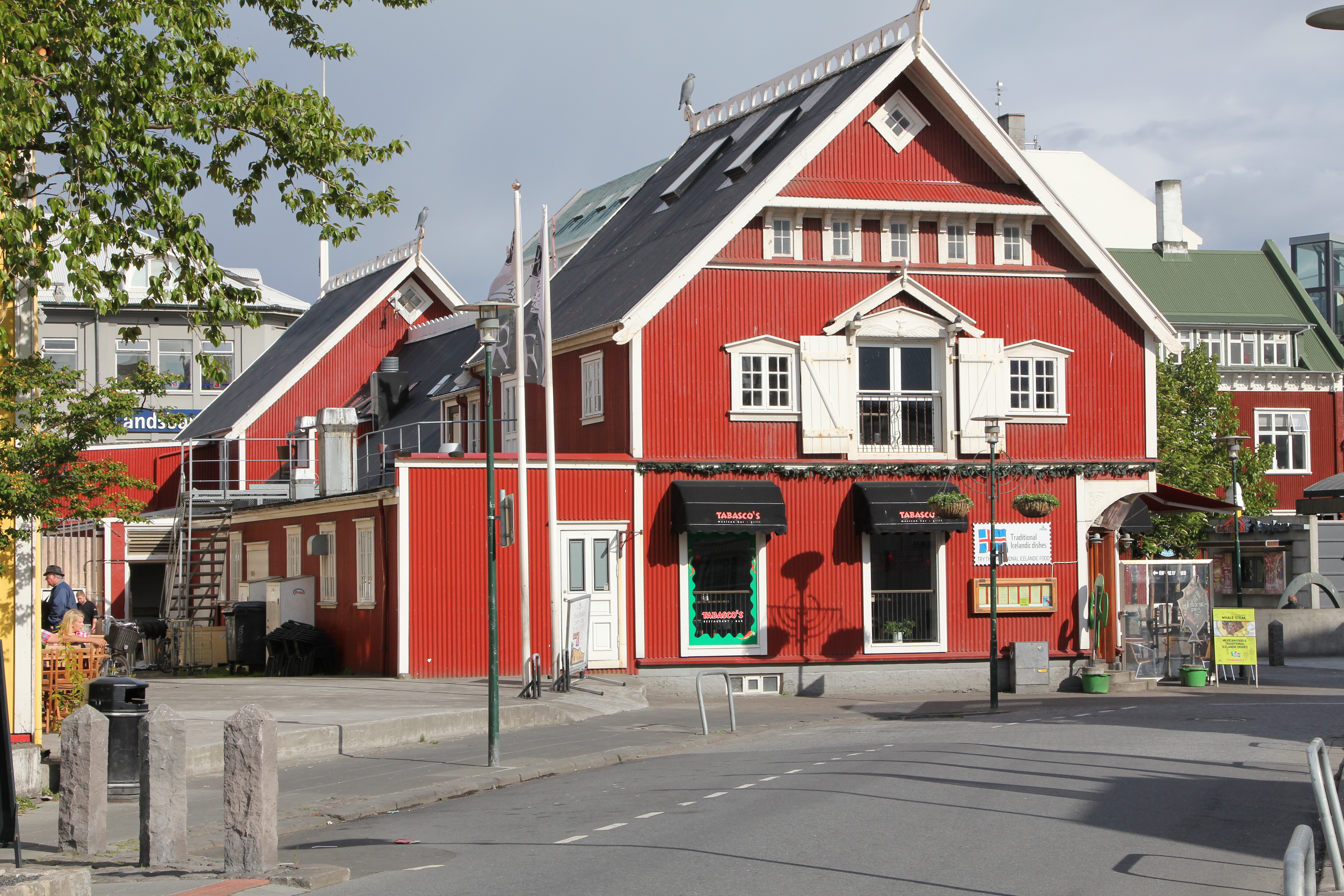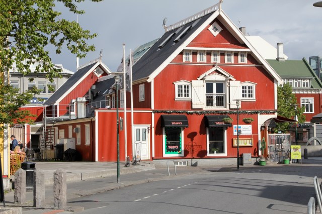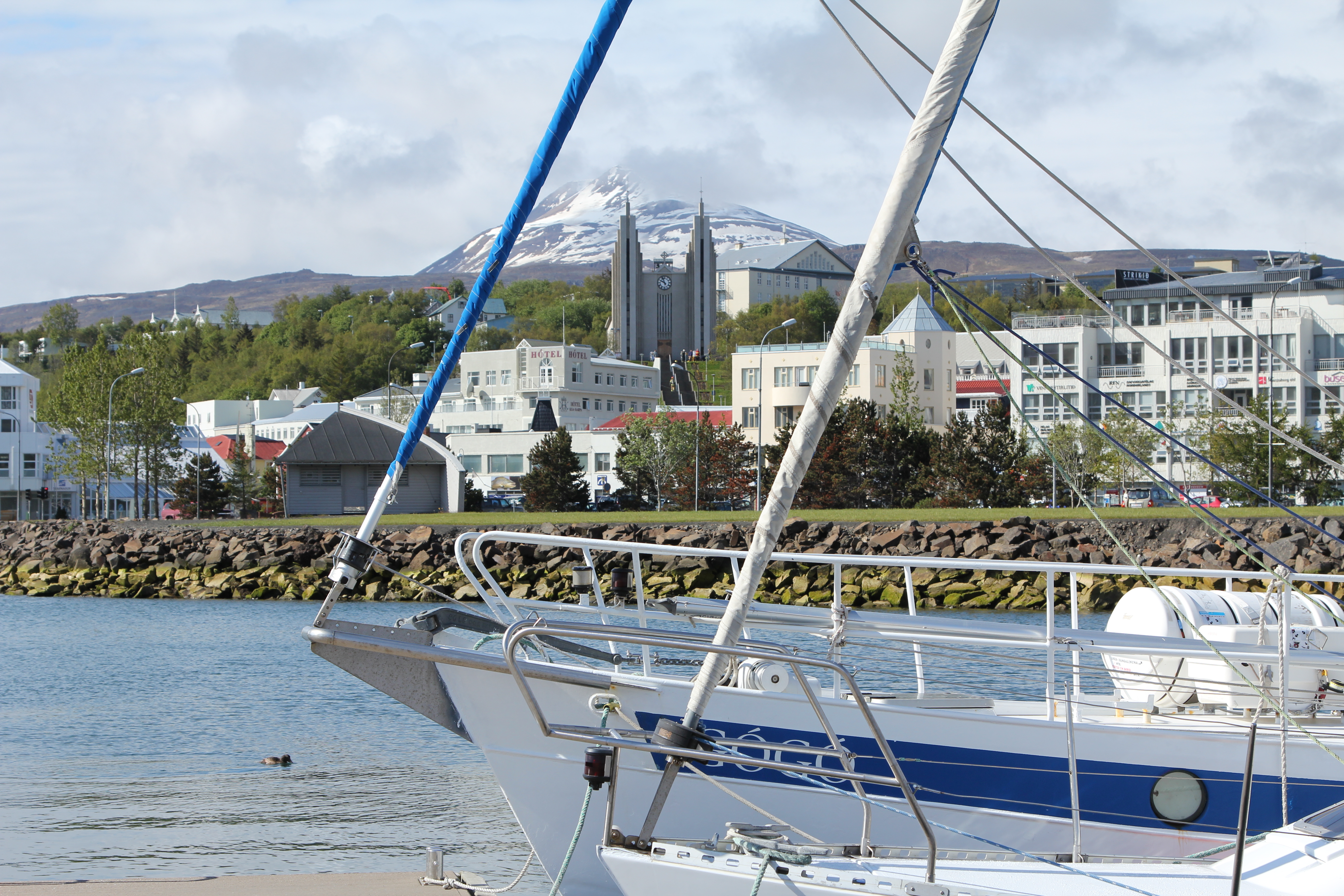 We hebben vandaag schitterend weer en ook de temperatuur is goed. Voor het eerst boven de tien graden. We kunnen deze middag in het zonnetje zitten. Reykjavik mag dan de hoofdstad zijn maar heeft nog een gemoedelijke sfeer. Hier woont 60% van de totale bevolking(tot:275.277). De wegen rondom de stad zijn ongelooflijk rustig. De stad heeft mooie modezaken, zeer aparte schoenenzaken, juweliers die prachtige sieraden van half edelstenen en lava verkopen. In het oude gedeelte zie je nog de traditionele golfplaten huizen. En veel vogels in de vijver voor het Gemeentehuis. Gebouwen van een mooie strakke architectuur zoals de eerder genoemde kerk, het nog in aanbouw zijnde conferentieoord Harpa en het watergebouw op de heuvel. Op de omloop bij de cafetaria heb je een prachtig uitzicht over de stad en de kerk die overal boven uit steekt.