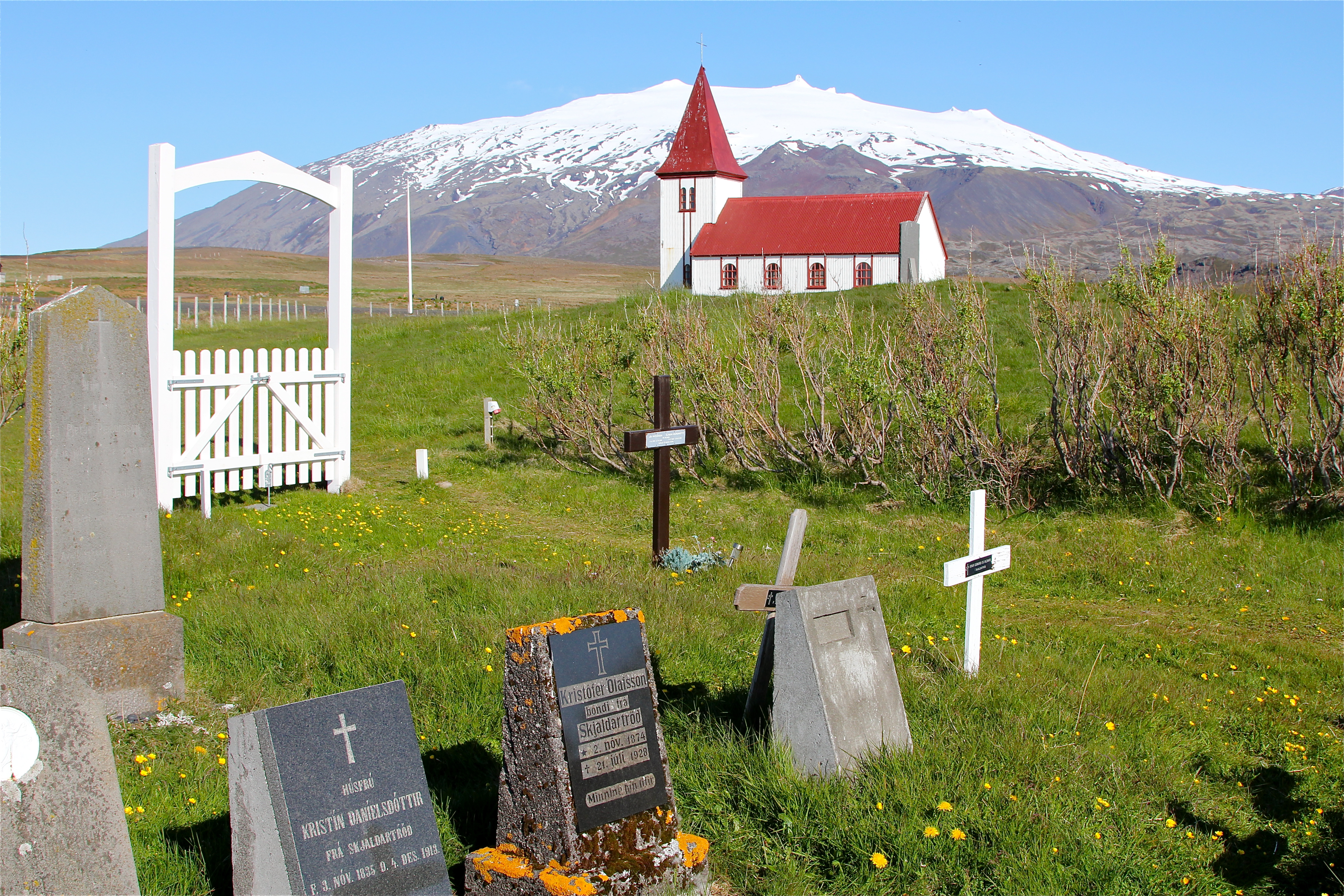 Zondag vervolgen we de route om dit schiereiland en we blijven ons verbazen. Een heldere dag vandaag, leuk om even een nieuwe foto te maken van het kerkje in Hellnar met de besneeuwde Sneafell op de achtergrond.