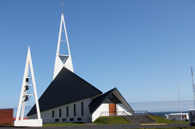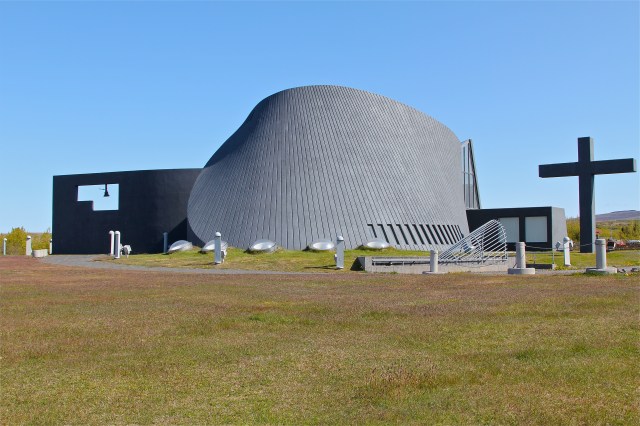 Als je het plaatsje uitrijdt, de rondweg op, kan het niet anders en je ziet een mooie moderne kerk liggen. Daar moet je gewoon even heen om nader te bekijken. De kerk is ontworpen door een boer uit de omgeving en moet een vulkanische krater symboliseren. Ook hier weer die mooie lichtinval.