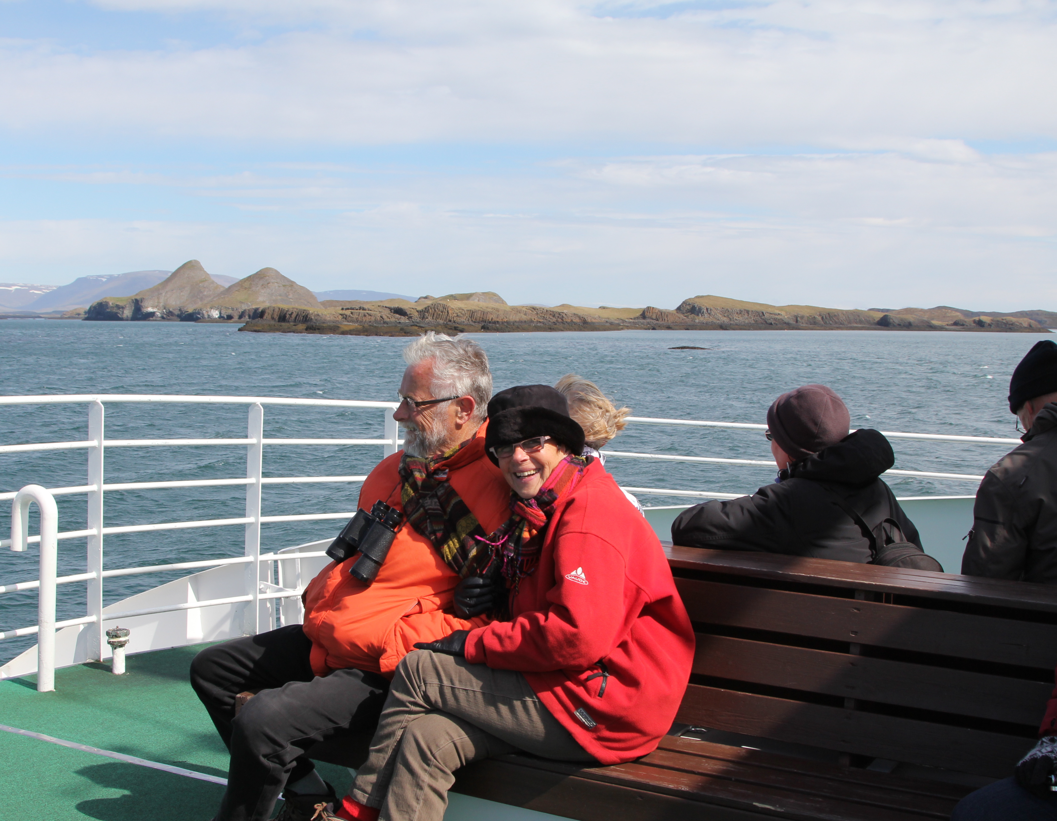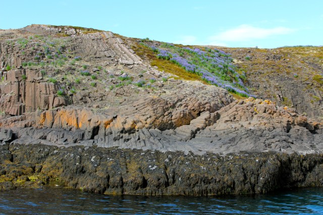 Al vroeg zijn we op de camping in Stykkisholmur . Vandaag staat voor de middag een boottocht, tussen de eilandjes die hier voor de kust liggen, op het programma. We treffen het bijzonder met het weer. Een strakblauwe lucht waardoor de sneeuwwitte bergtoppen haarscherp te zien zijn.Weer mooie basalt formaties. En de lupine, je ziet hem overal in IJsland.