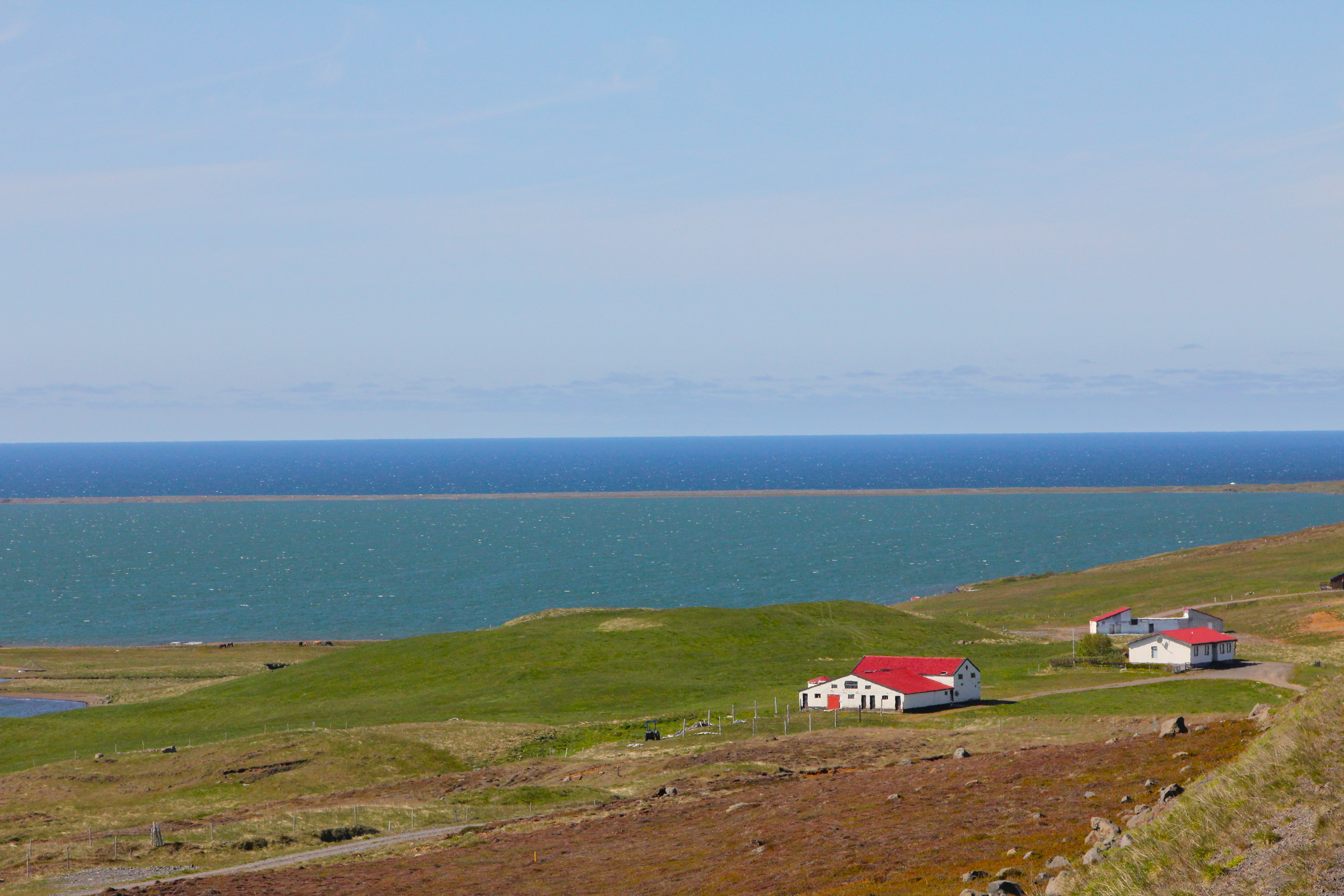 We rijden via weg 76 verder en zien veel paarden boerderijen. Je ziet ze overal in IJsland maar dit gebied is toch wel de kern. Het wordt eentonig maar ook hier is het weer prachtig. Je ziet een hele duidelijke overgang tussen fjord en oceaan. In de fjord lichtblauw, oceaan donkerblauw.