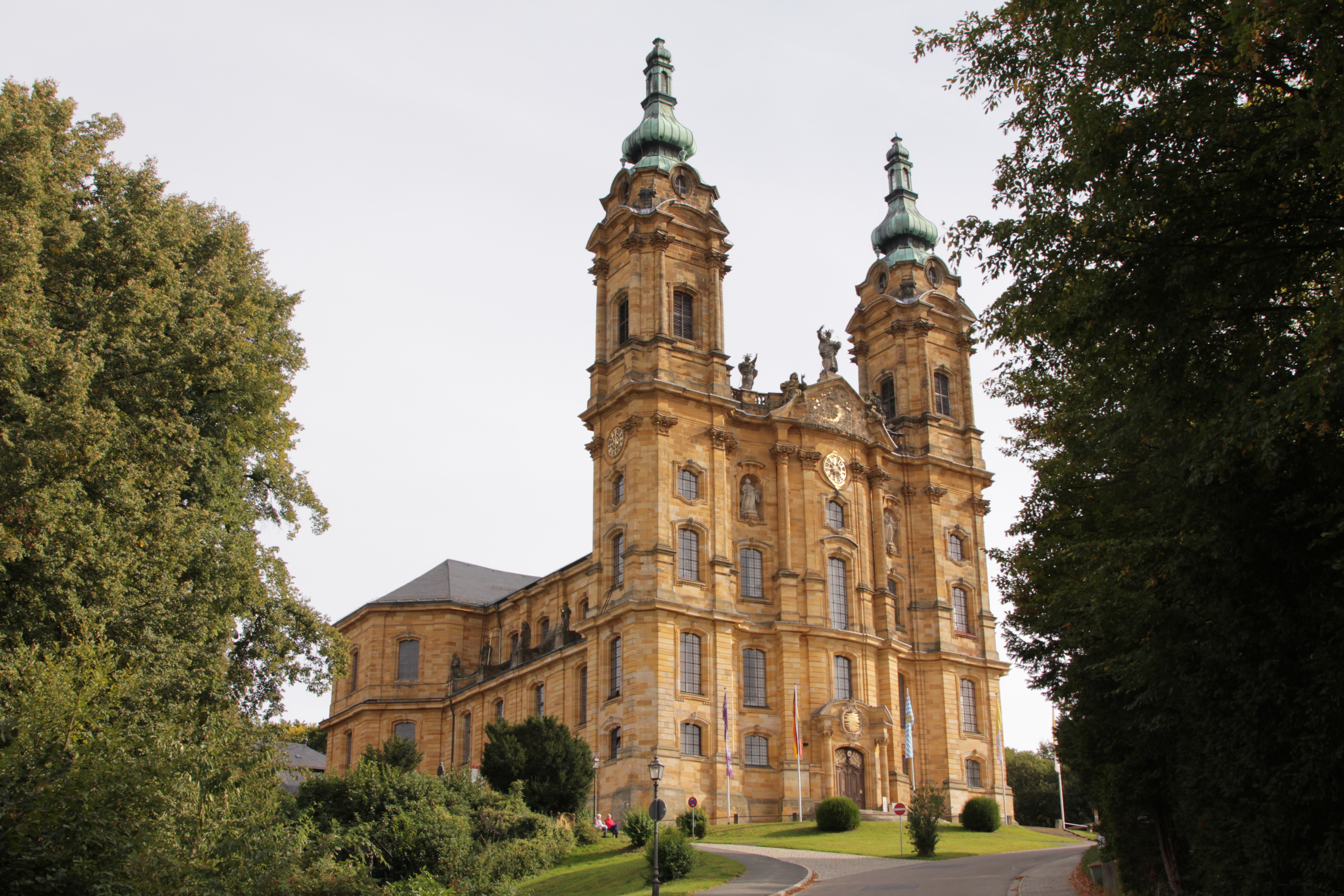 21-09-12. De Plassenburg een grote burcht ligt hoog boven Kulmbach. Een beste klim naar boven. Er wordt druk gewerkt aan het gebouw. De binnenplaats is rijk versierd met beeldhouwwerk maar als geheel kan het gebouw me niet bekoren. Kulmbach ligt aan de Witte Main en zeven km verder stroomafwaarts komt de Rode Main erbij. Natuurlijk gaan we dat punt ook even opzoeken. Vanuit de plaats door goede bewegwijzering voor fietsers makkelijk te vinden. Je moet echt wel op de fiets, anders kan je er niet komen. Op weg naar Bamberg bezoeken we de Basiliek Vierzehnheiligen.