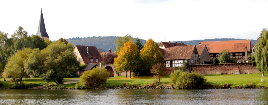 27-09. Naar de camperplaats in Kitzingen. Parkeren en fietsen. We zijn al langs heel veel leuke plaatsen gekomen maar Sulzfeld an Main wist ons toch weer te verrassen. Geen touristentrekker maar een mooi plaatsje met stadsmuren waarvan de torentjes aparte daken hebben.