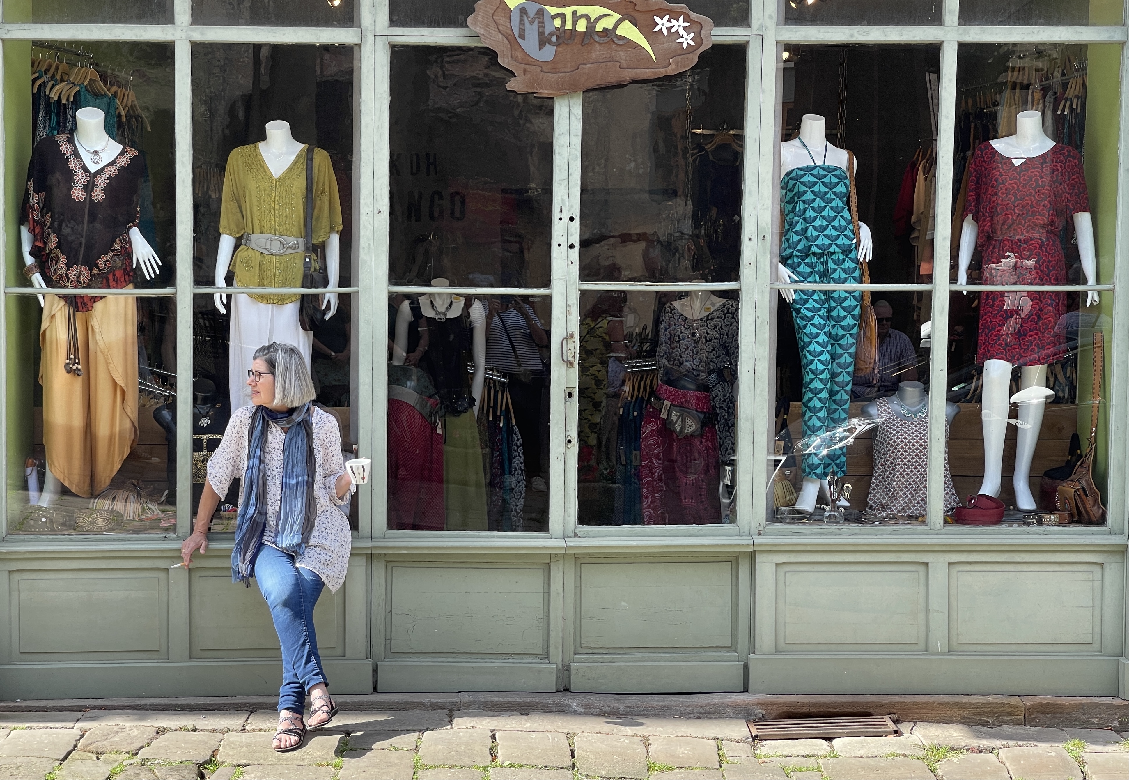 De mevrouw op de foto zat de vorige dag precies zo voor haar winkel. Je vraagt aan haar of je in de winkel kan kijken en het steevaste antwoord: over vijf minuutjes als mijn sigaret op is.