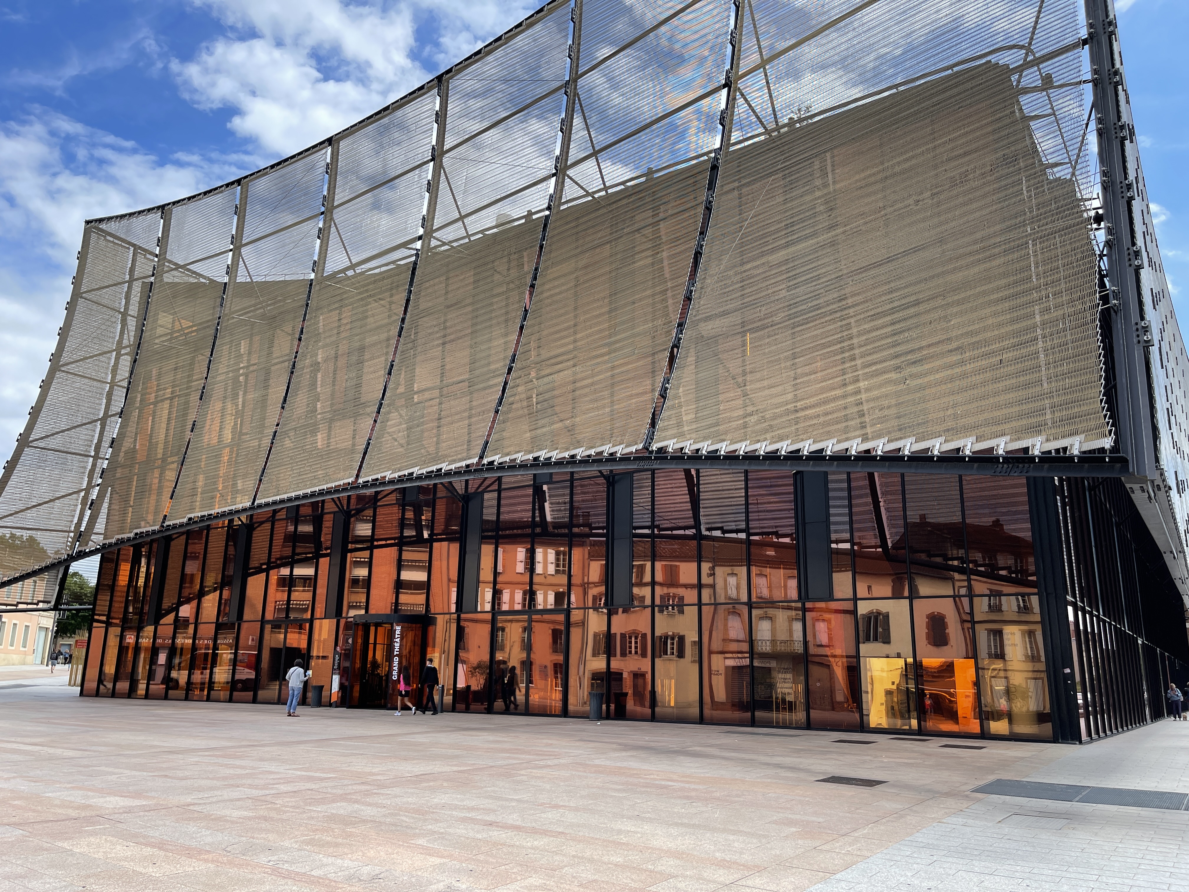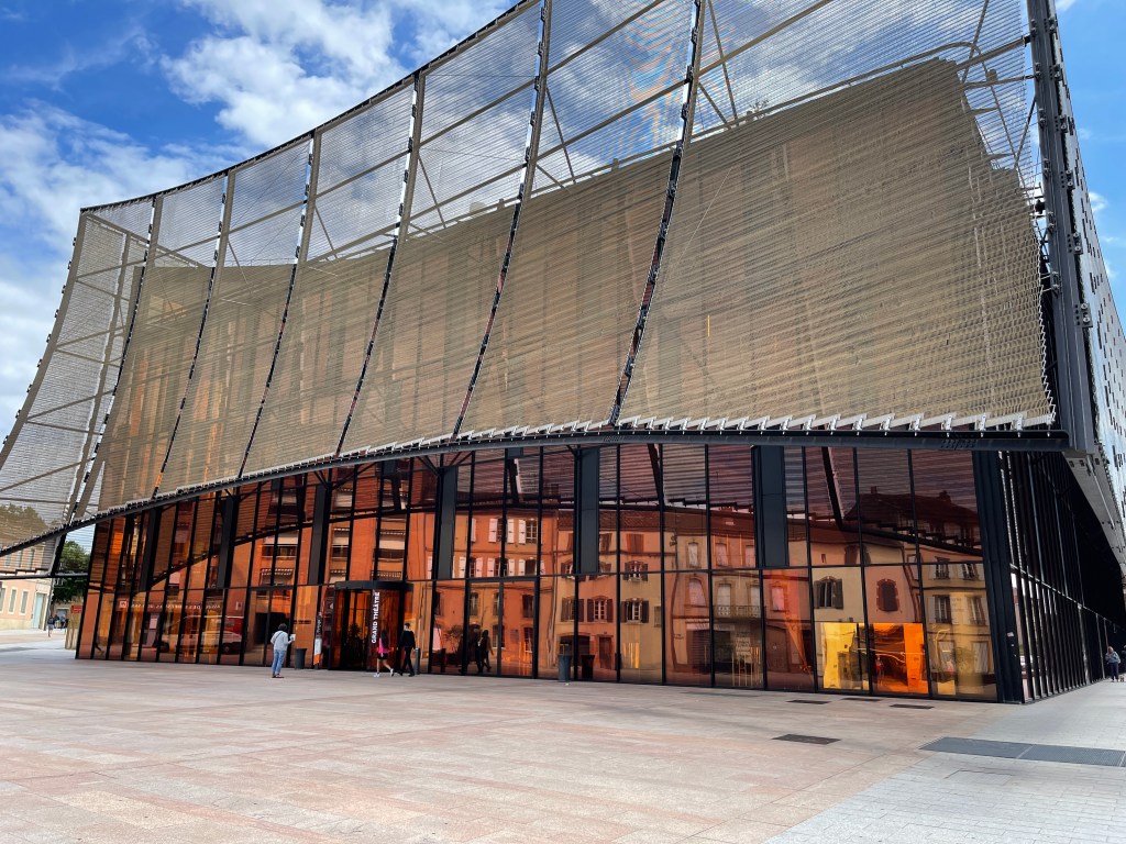 Aan de rand van het historisch centrum staat het nieuwe theater/cultureel gebouw. Een grote glaswand en een metallic netwerk. Heel apart en ik vond het geweldig. De huizen van de overkant weerspiegelen in de glazen pui.