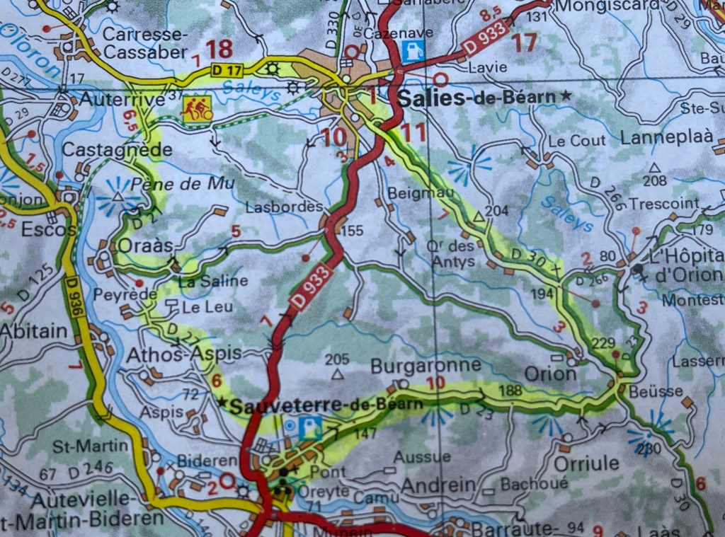 Maandag ’s nachts onweer en gigantisch veel regen. Nu mooi weer, niet te warm, mooi fietsweer. Leuke route gefietst, via Sauveterre de Bearn, hoge weg heen, laag terug , Vanaf Castagnede de Voie Verte genomen (groene stippels op de kaart).