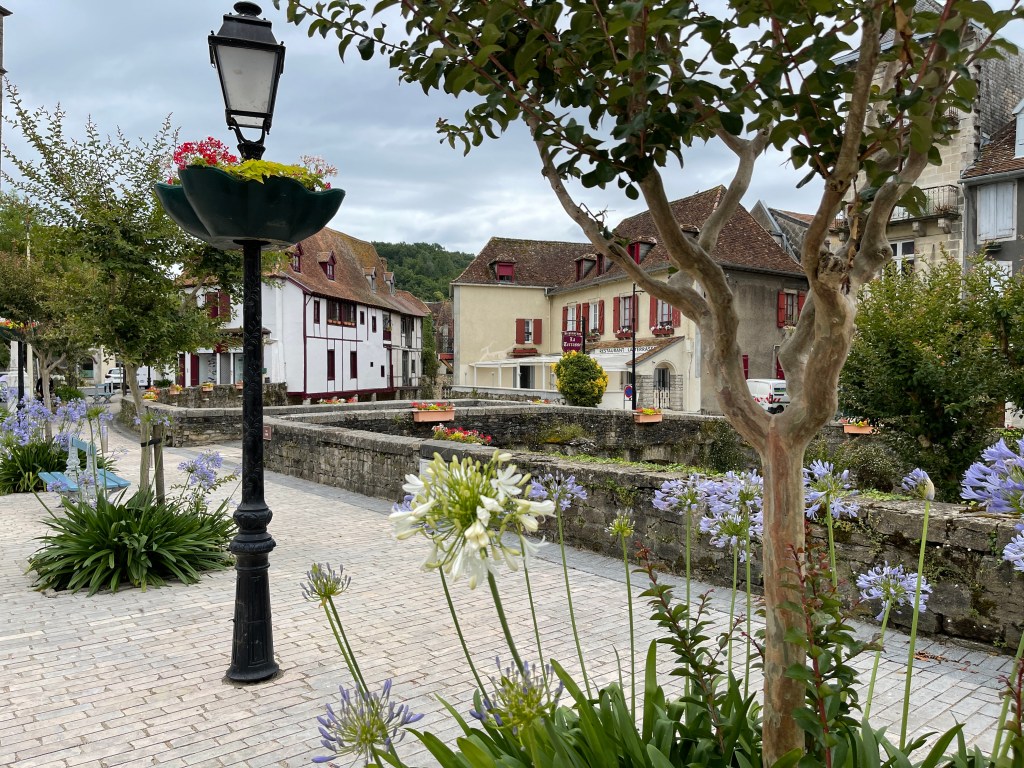 de bus doet een prima restaurant aan waar we een heerlijke kalfsvlees stoofpot geserveerd wordt. En weer gebak met ijs toe. Versterkt rijden we naar een espadrilles fabriek. Ze zijn niet duur maar het lijkt me helemaal niets. En dan de hoogte in, mooie vergezichten. De natuur is hier overal overweldigend groen en ja dat betekent veel regen. Als laatste stoppen we nog in Sauveterre waar ik al eerder op de fiets geweest was.