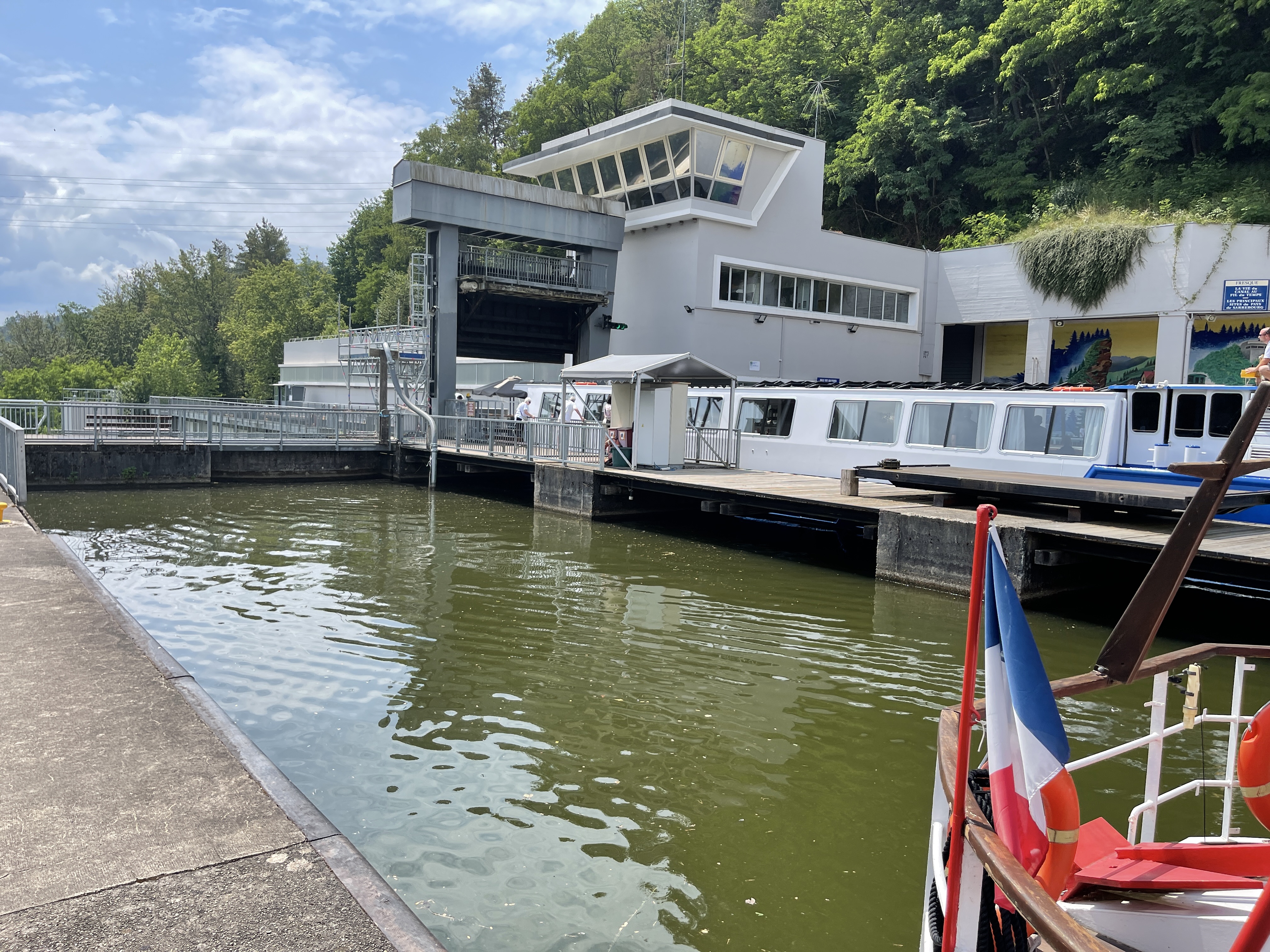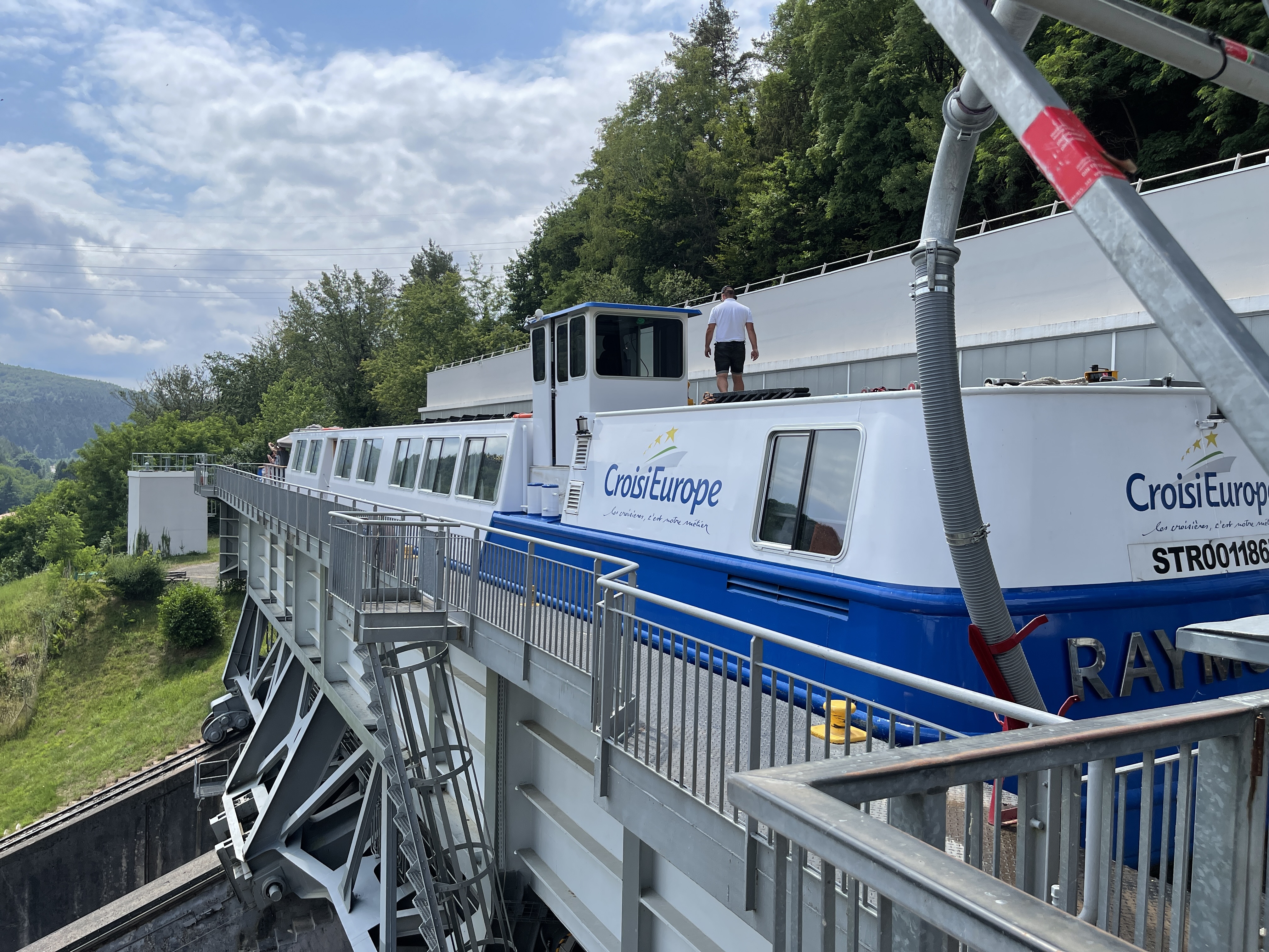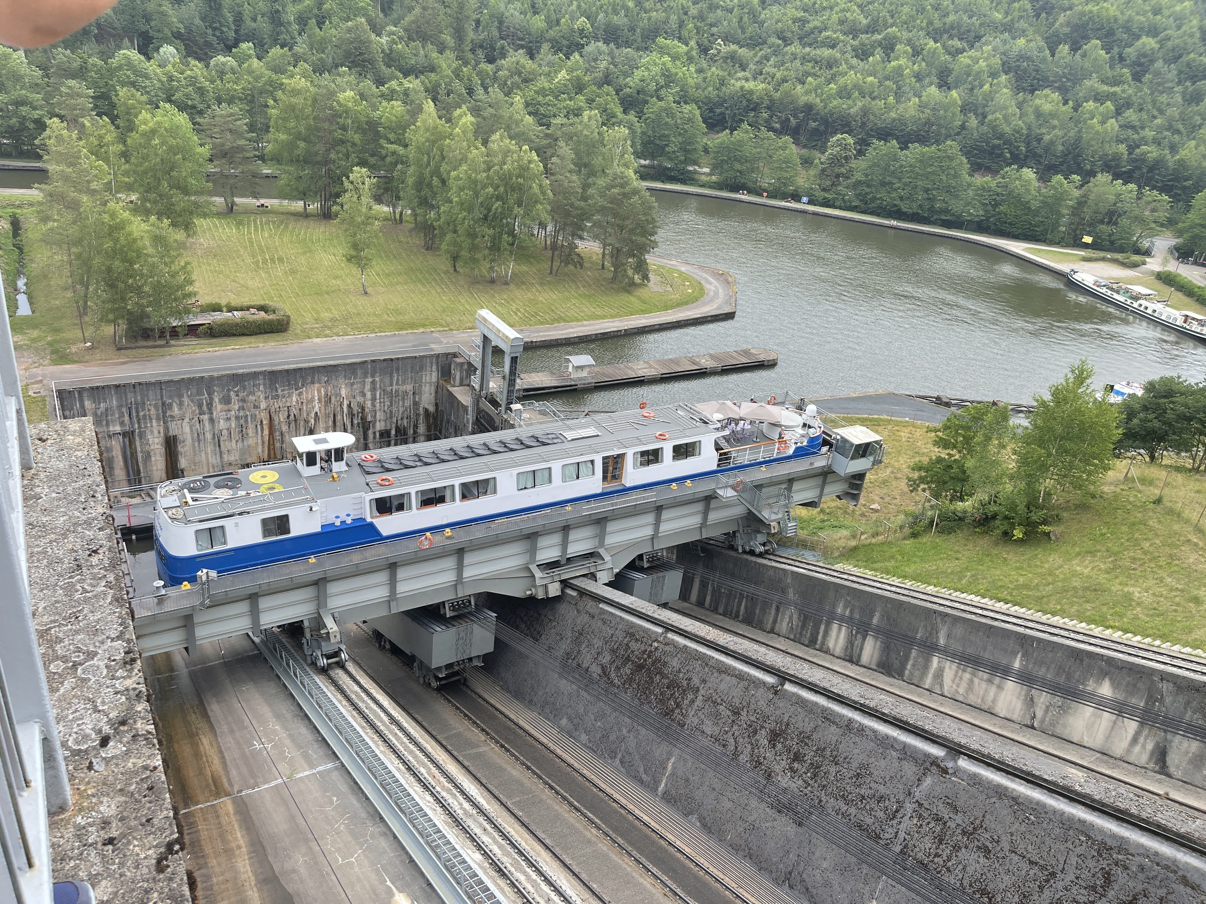 Het hellend vlak van St. Louis-Arzviller. Prachtig om te zien. De schepen varen horizontaal in en gaan verticaal naar beneden. Een waar kunstwerk. Ondanks de warmte hier geruime tijd doorgebracht en ook naar beneden gelopen om vandaar omhoog te kunnen kijken. Overnachting in Vilsberg. Gelukkig een restaurant op de camping.