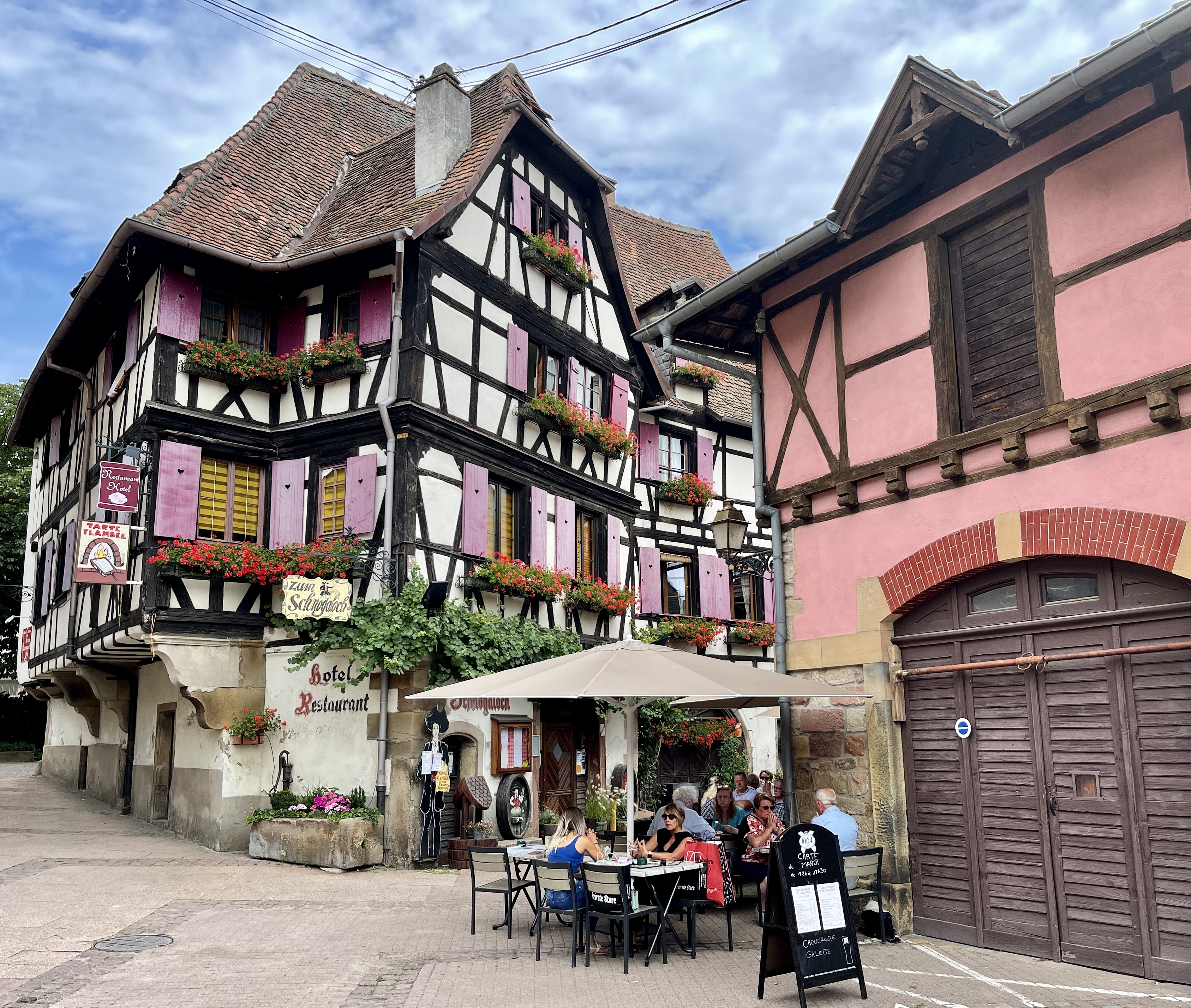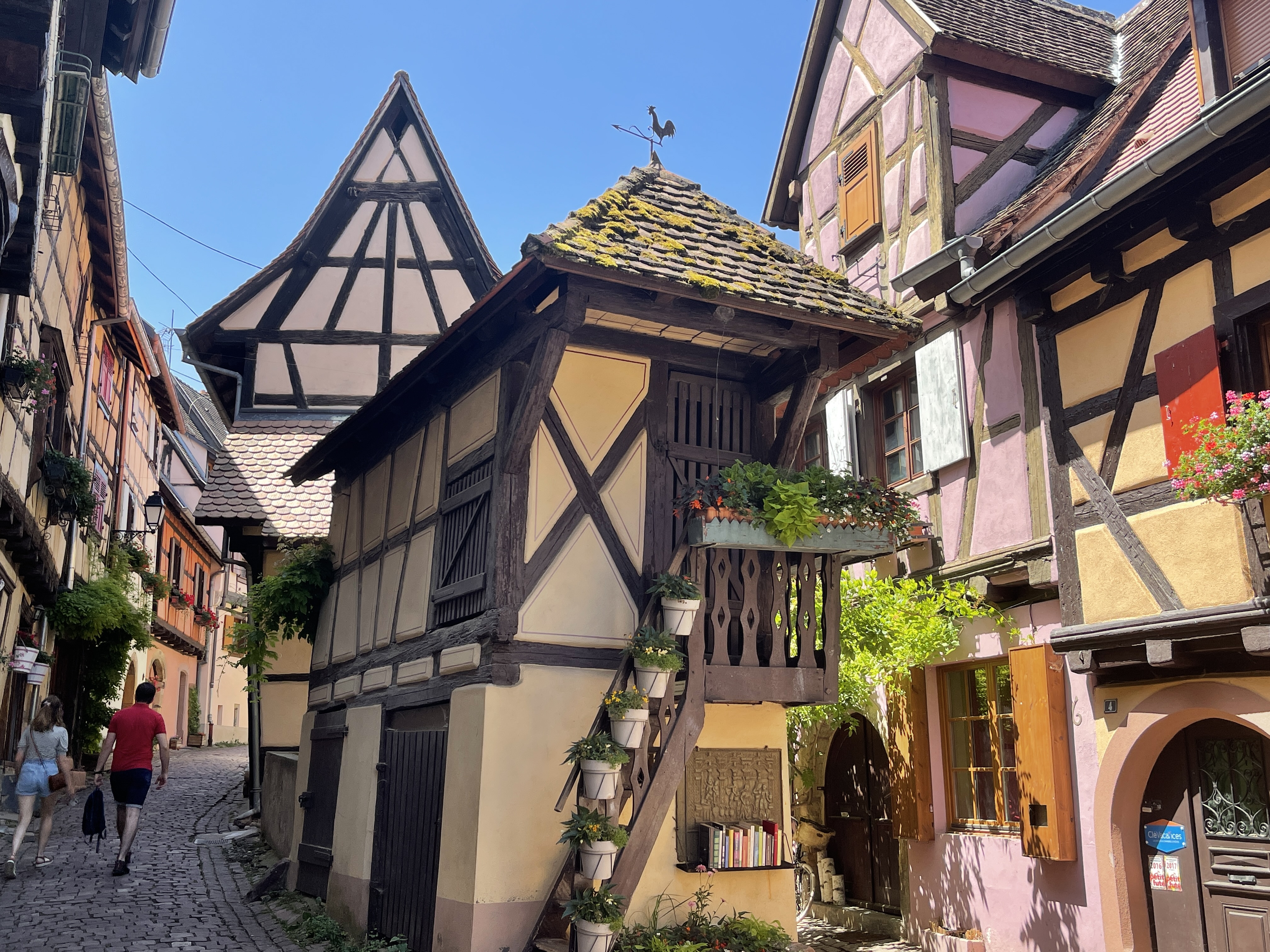 Terug naar de camping, snel inladen en naar Eguisheim. Ik vond Eguisheim prachtig voor mij het mooiste dorp tot nu toe. Vanwege de smalle straatjes met schaduw was het rondlopen goed te doen. We wilden lunchen en eindelijk maar gezwicht voor de Flammkuchen die je in duizenden variëteiten overal in de Elzas kan krijgen.