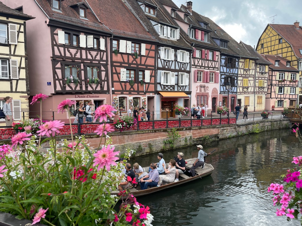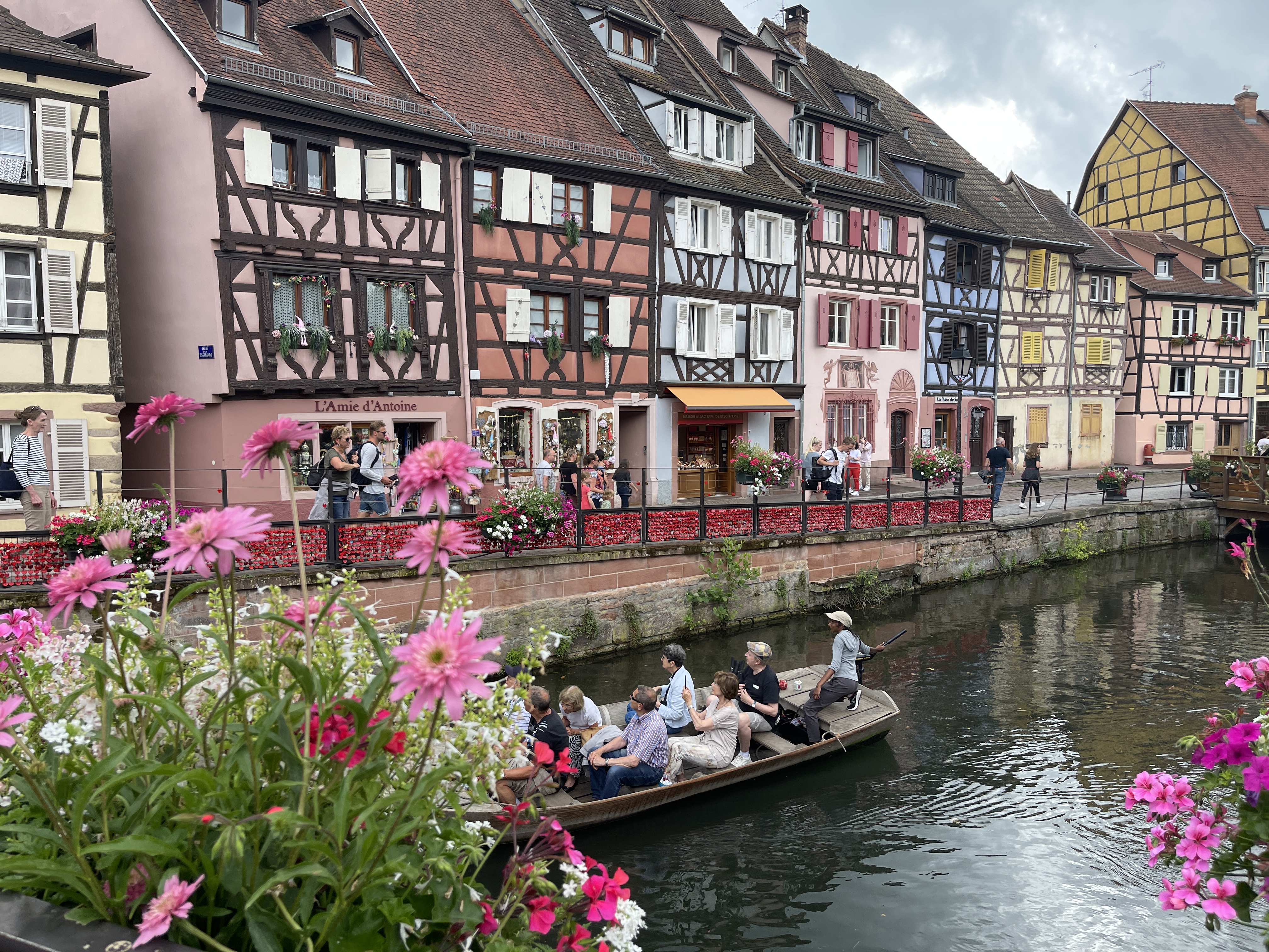 Een pittige nacht achter de rug, stevig onweer en fikse regenbuien. Ook in de ochtend bleef het regenen. We besloten een nachtje bij te boeken, maar wel op een andere plek op de camping. We stonden met twee campers op EEN slechte scheve plek, gras niet gemaaid en naast de toiletten. Omdat we alleen in de camper zijn betalen we op sommige campings maar voor één persoon. Voor deze plek 12,00 euro en met twee 18,00. Het bleef regenen, om 12.00 uur ben ik vast gaan koken want stel dat het droog wordt dan komen we laat thuis en is het eten mooi klaar. En zo geschiedde om half twee droog, op de fiets naar Colmar. Mooi via de wijngaarden en alle andere fruitsoorten die hier verbouwd worden. Colmar is gewoon leuk en veel te zien. Veel bekender en veel drukker. Veel details aan de vakwerkhuizen. 40 km gefietst, half zeven thuis en de eerste druppels vielen op een km afstand. Wat een timing, net op tijd binnen. Het “klein Venetië” is zeer charmant.