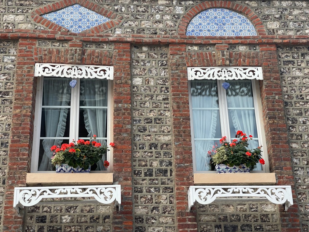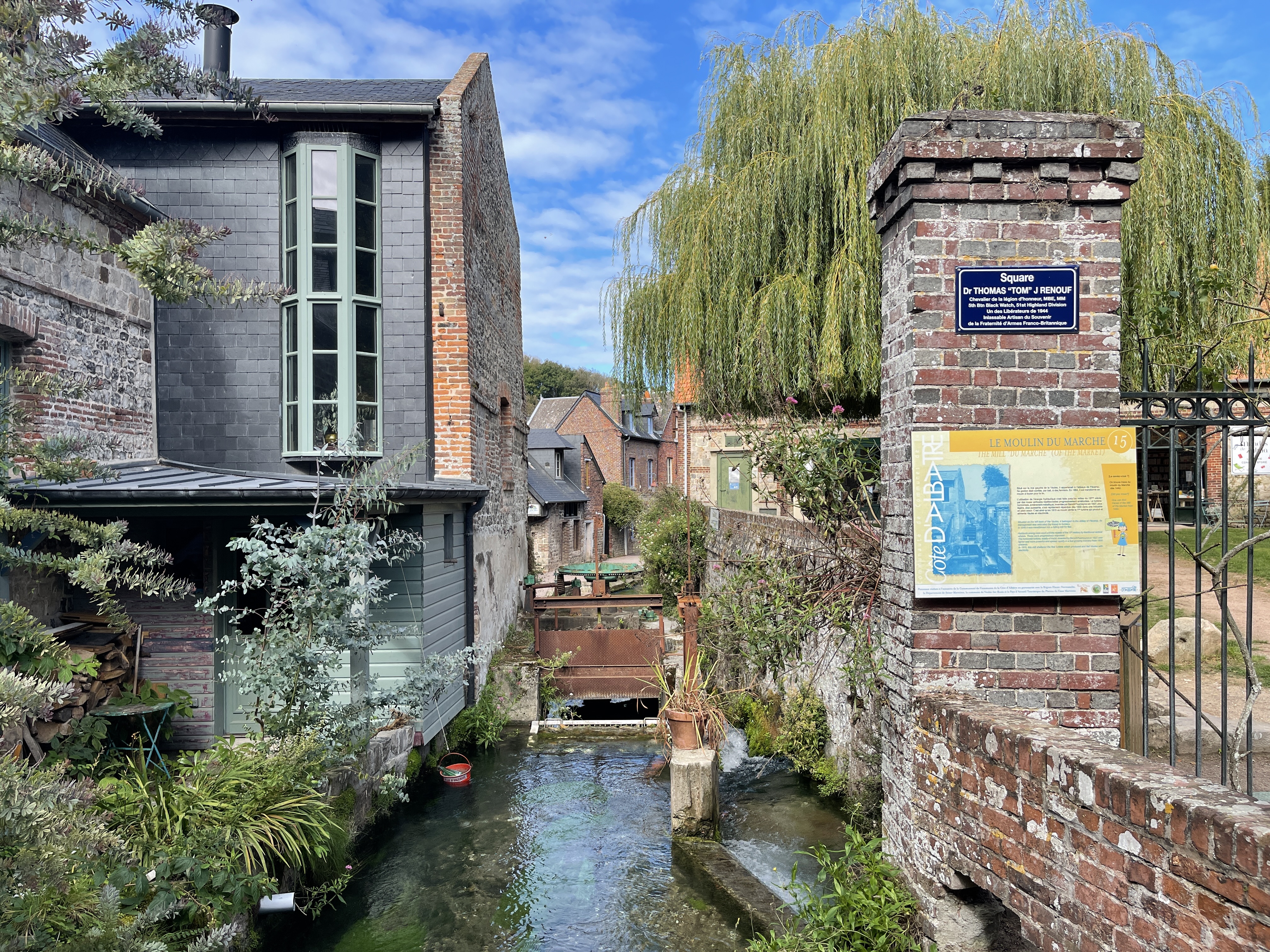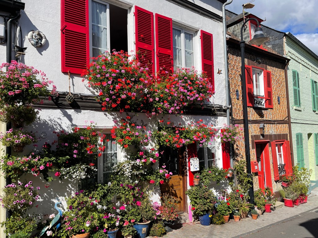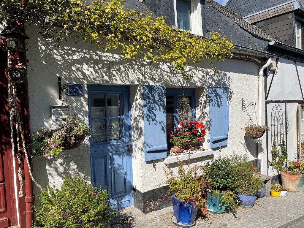 21 sept. Onderweg naar Veules-les-Roses koffie gedronken onder de krijtrotsen van Quiberville. Op deze rit waren we alle drie verrukt van de architectuur. De manier waarop hier gebouwd werd sprak ons aan. In Veules-les-Roses was markt. Aan de ene kant leuk maar aan de andere kant jammer. Je ziet minder van de huizen. Aardige wandeling achter de huizen langs het riviertje de Veule waarvan de bron net even buiten het dorp ontspringt. Ik las later dat het de kleinste rivier van Frankrijk is; 1149 m lang.