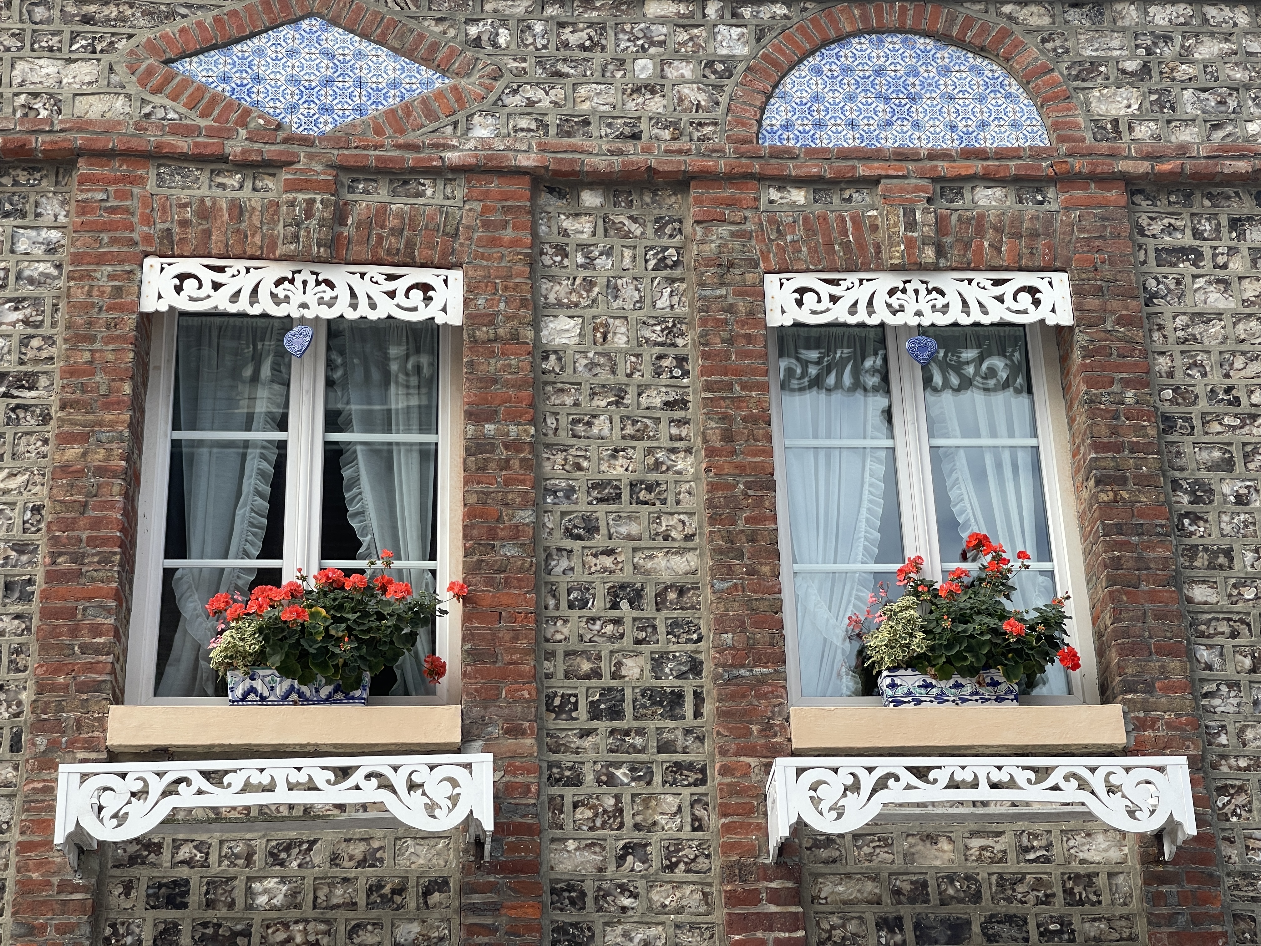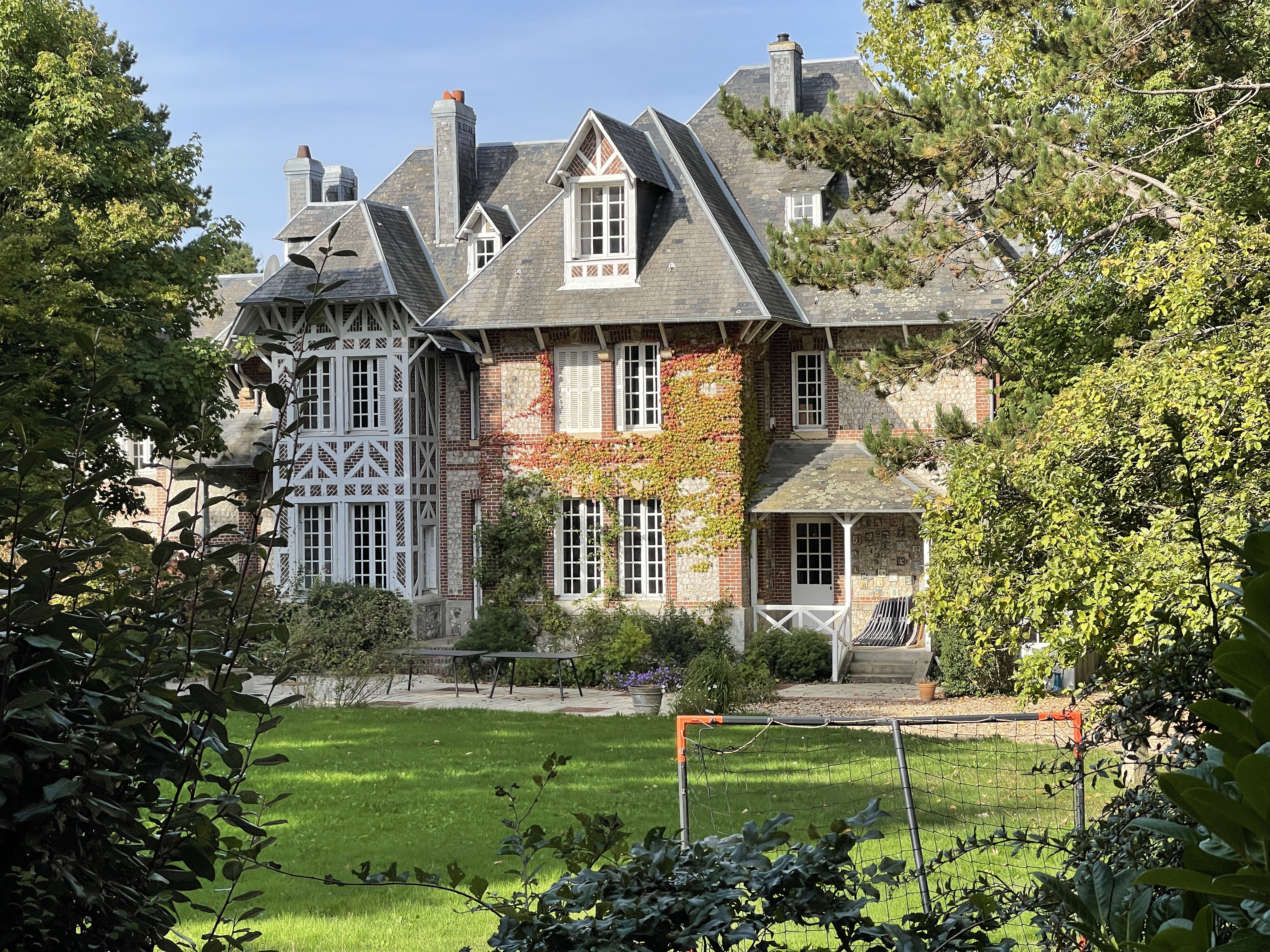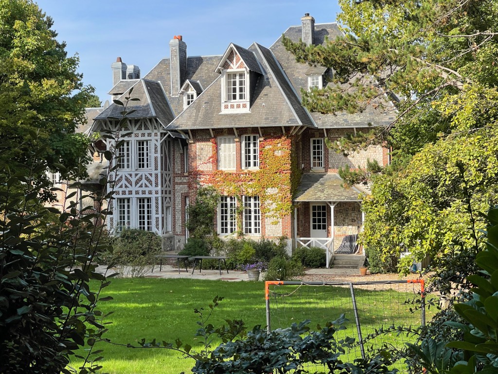 21 sept. Onderweg naar Veules-les-Roses koffie gedronken onder de krijtrotsen van Quiberville. Op deze rit waren we alle drie verrukt van de architectuur. De manier waarop hier gebouwd werd sprak ons aan. In Veules-les-Roses was markt. Aan de ene kant leuk maar aan de andere kant jammer. Je ziet minder van de huizen. Aardige wandeling achter de huizen langs het riviertje de Veule waarvan de bron net even buiten het dorp ontspringt. Ik las later dat het de kleinste rivier van Frankrijk is; 1149 m lang.