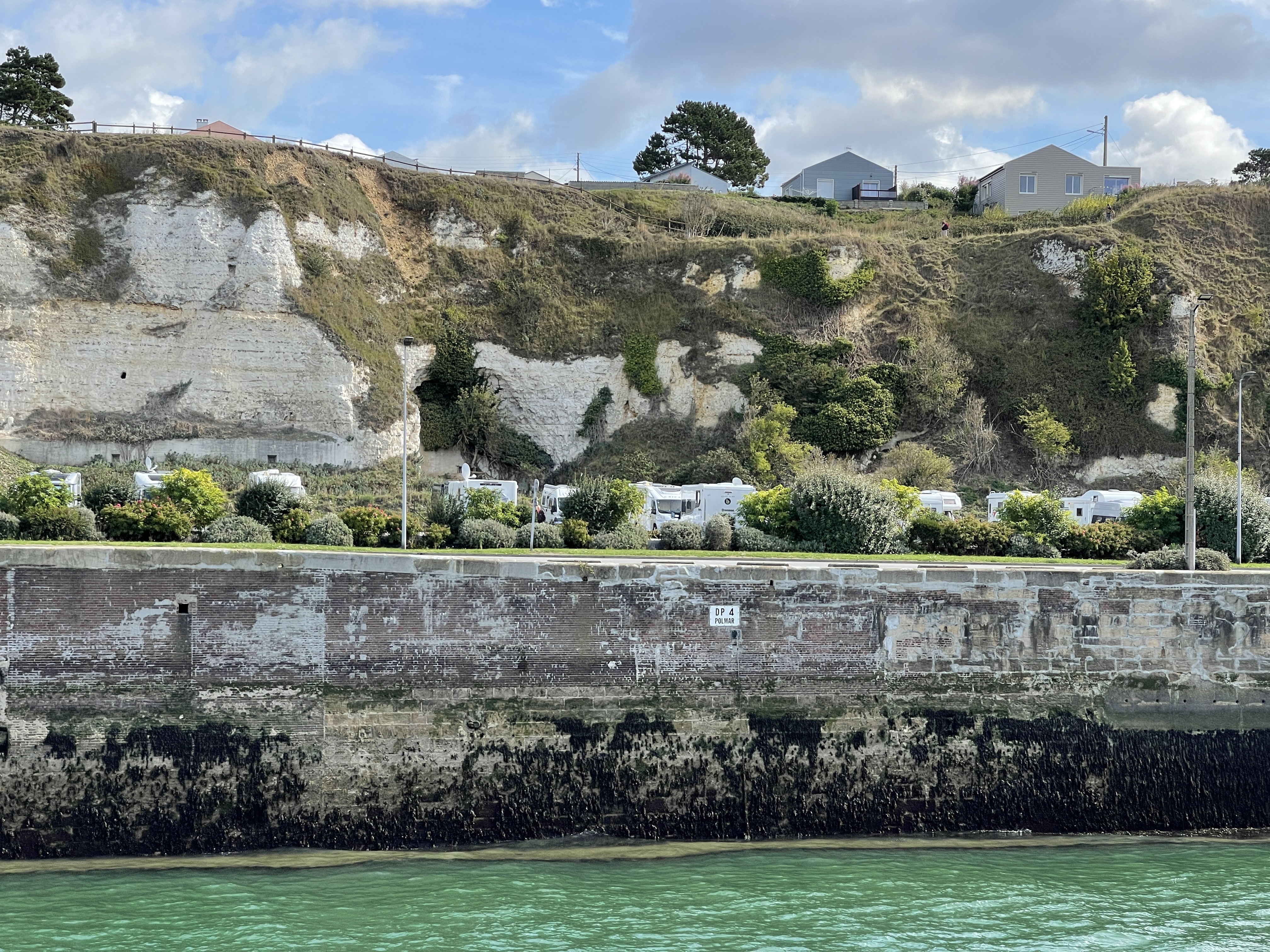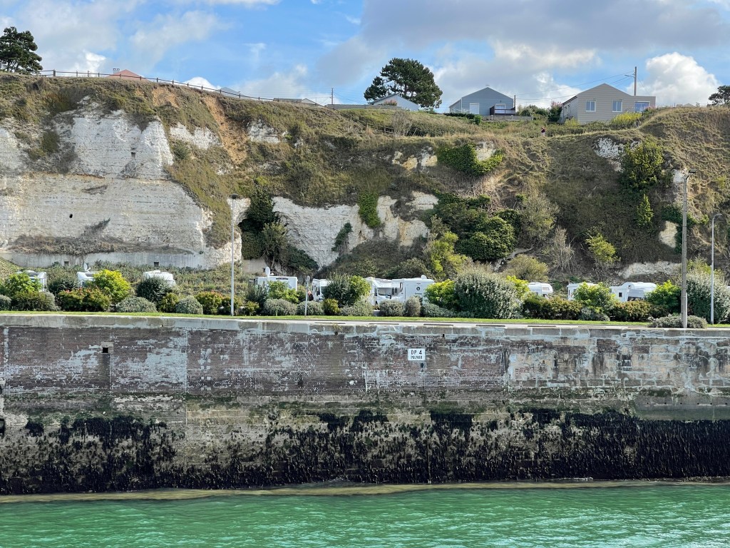 20 september. Kort ritje vandaag voor een bezoekje aan Dieppe. Camperplaats (1142) in het haven gebied. Tijdens het wandelen kwamen we de ander CP tegen. Die kijkt uit op de veerboten.