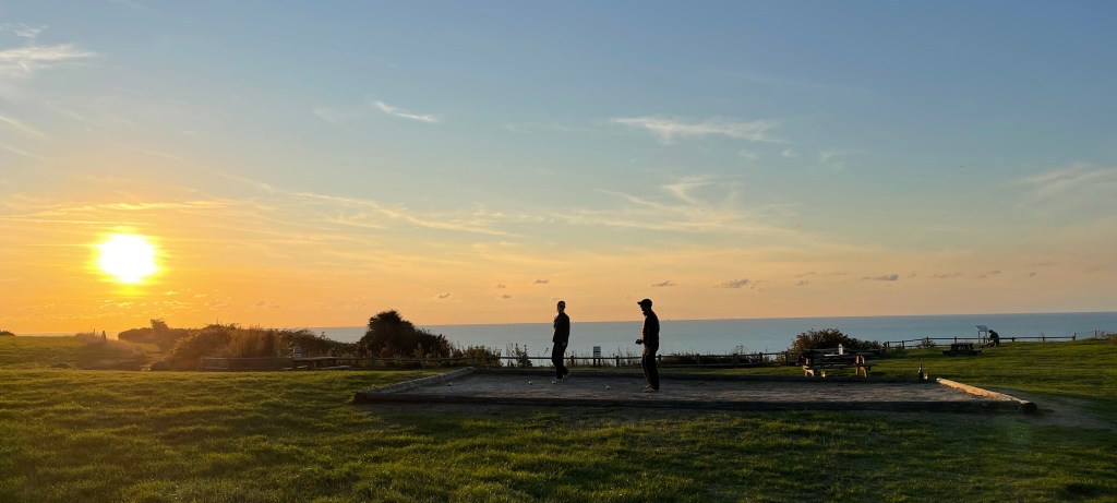 We overnachten vandaag op een mooi gelegen camping met zwembad en fijne douches. Een aanrader camping Huttopia les Falaises. Lia en Jolanda hebben lekker gezwommen in het overdekte zwembad. En wat te denken van een jeu de boulesbaan met uitzicht op zee en de zonsondergang.