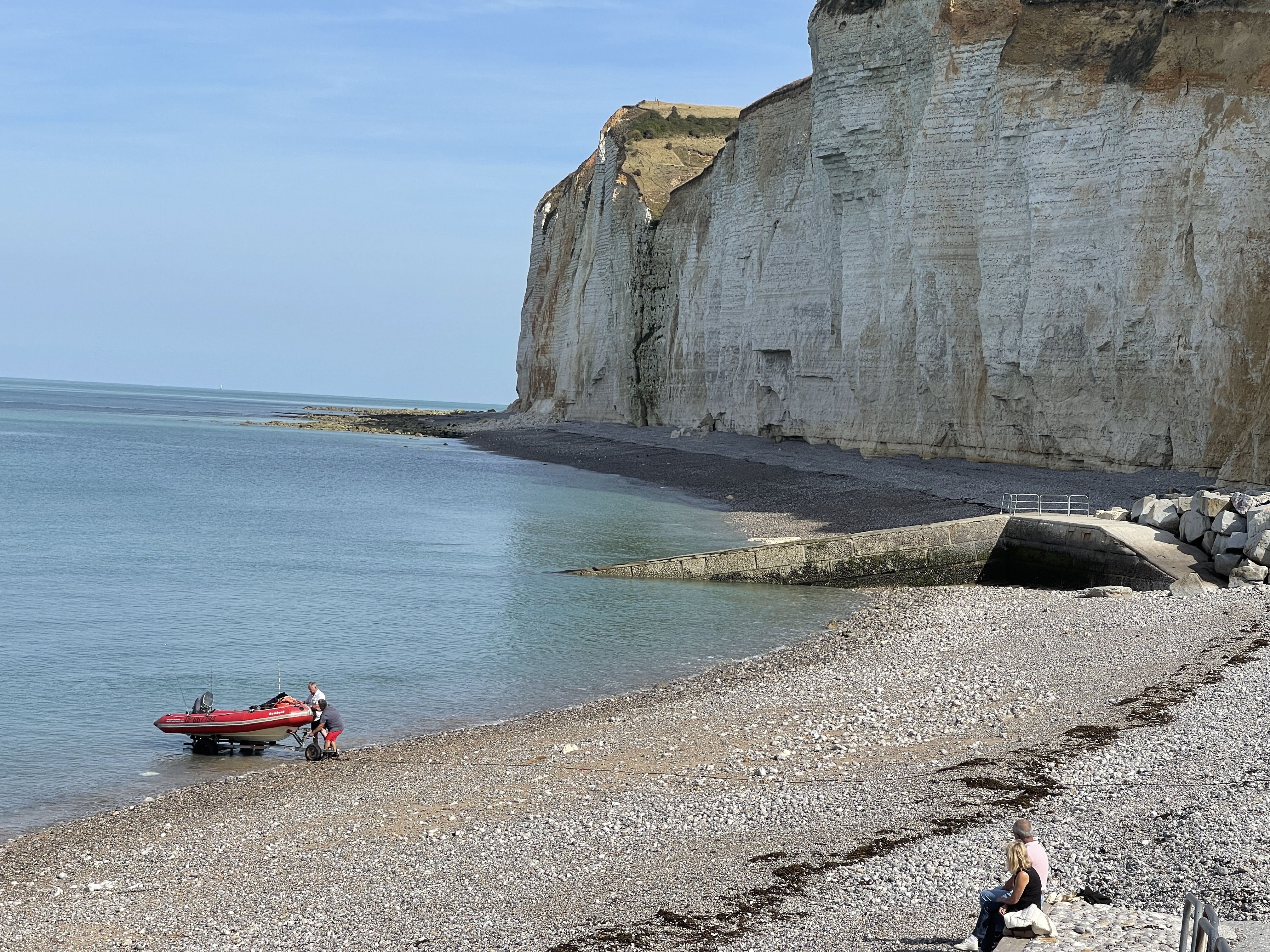 Dagje bijgeboekt op deze fijne camping. Wandeling naar het strand 1,5 km naar beneden. Lia en Jolanda gaan toch maar weer zwemmen in het verwarmde bad hoewel lia als ze waterschoenen had gehad ongetwijfeld een duik in de zee had genomen. En we zagen een zeehondje, dat geloofden we. De dame die naast ons stond had het over een dolfijntje. Later zeiden we: ben je gek, we zagen echt geen zeehond en al helemaal geen dolfijn. Wel de mooie krijtrotsen.