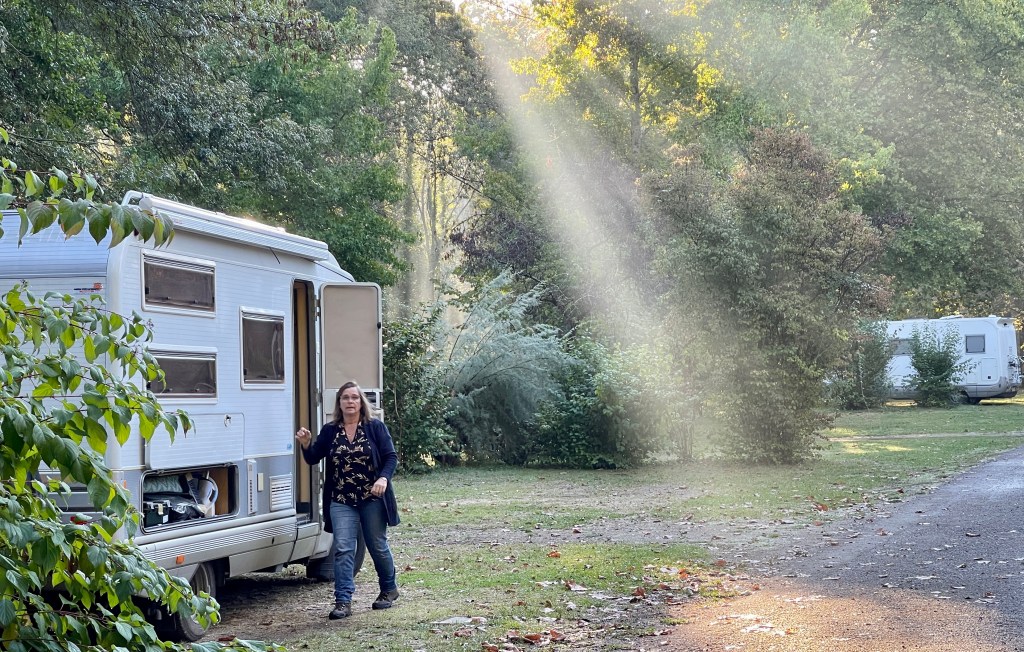 Jammer, het zat even een klein beetje tegen met de overnachtingsplek van vandaag.Vanmorgen nog gebeld of het kon maar bij aankomst bleek dat men toch liever had dat we weg zouden gaan. De France Passion gastheer bracht ons nog wel naar een parkeerplaats waarvan hij vond dat je er ook goed kon staan maar wij dachten daar anders over. En nu dus, in de stromende regen, bij een ganzenboerderij met een mooi winkeltje waar we een potje eend met calvados en een recht hoekige droge worst kochten. Allebei super lekker. Het regent pijpenstelen maar binnen hebben we het gezellig.