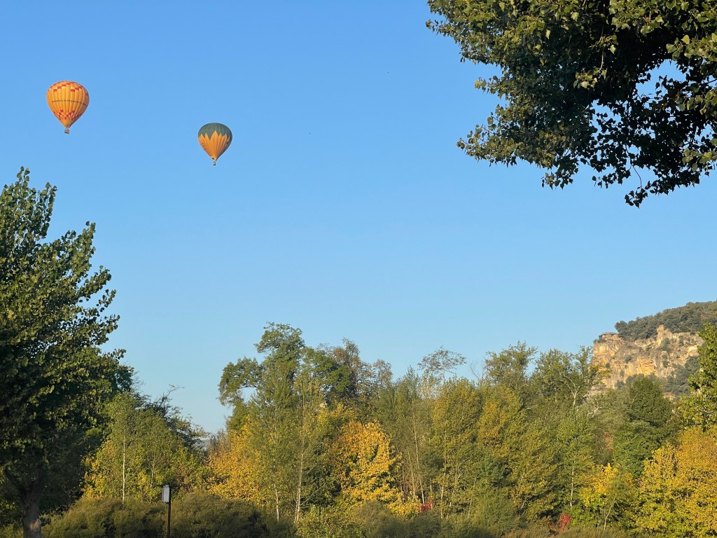Vanmorgen in La Rogue nog lekker in de camper met een kop koffie, hoorde ik het blazen van ballons. In de ochtendjas naar buiten. Mooi gezicht de vertrekkende ballonvaarten.
