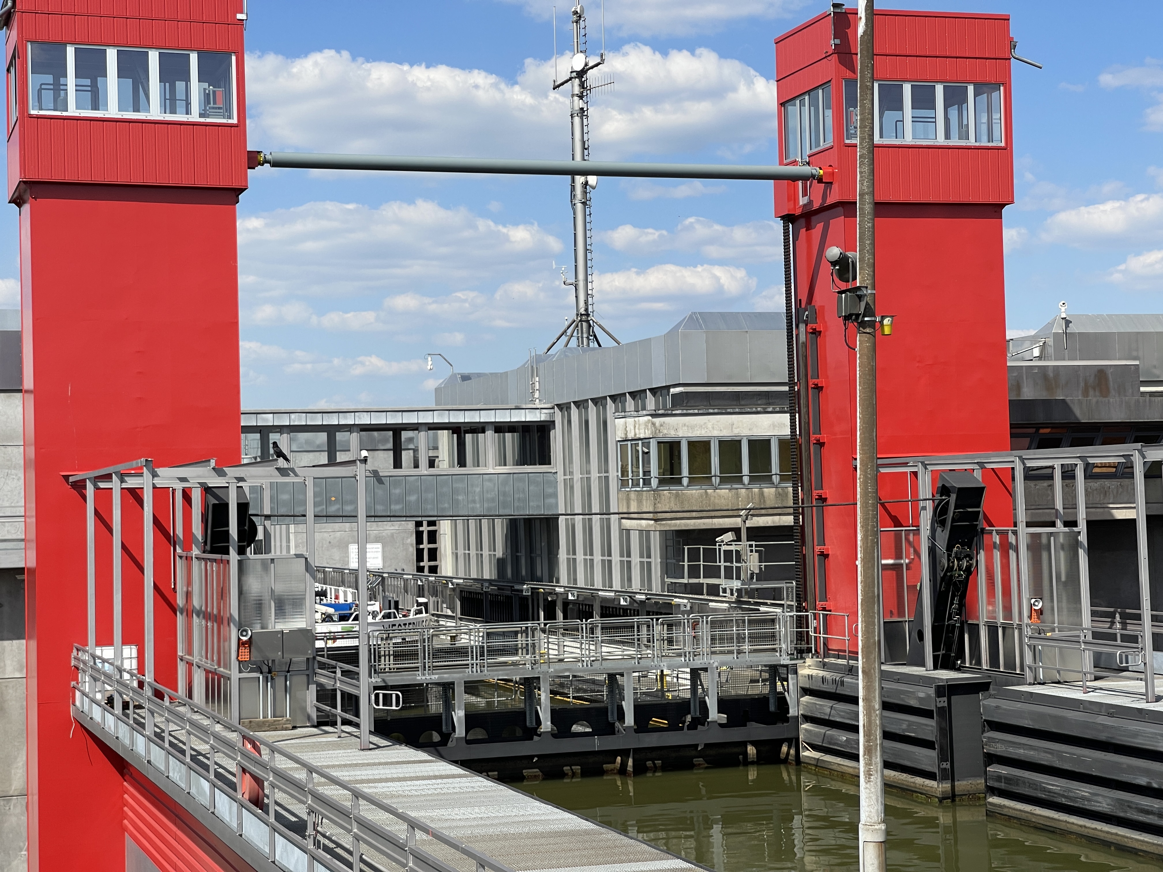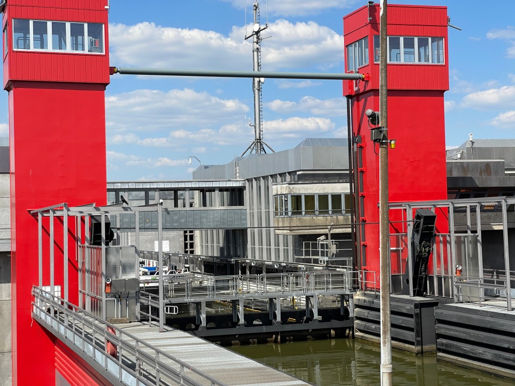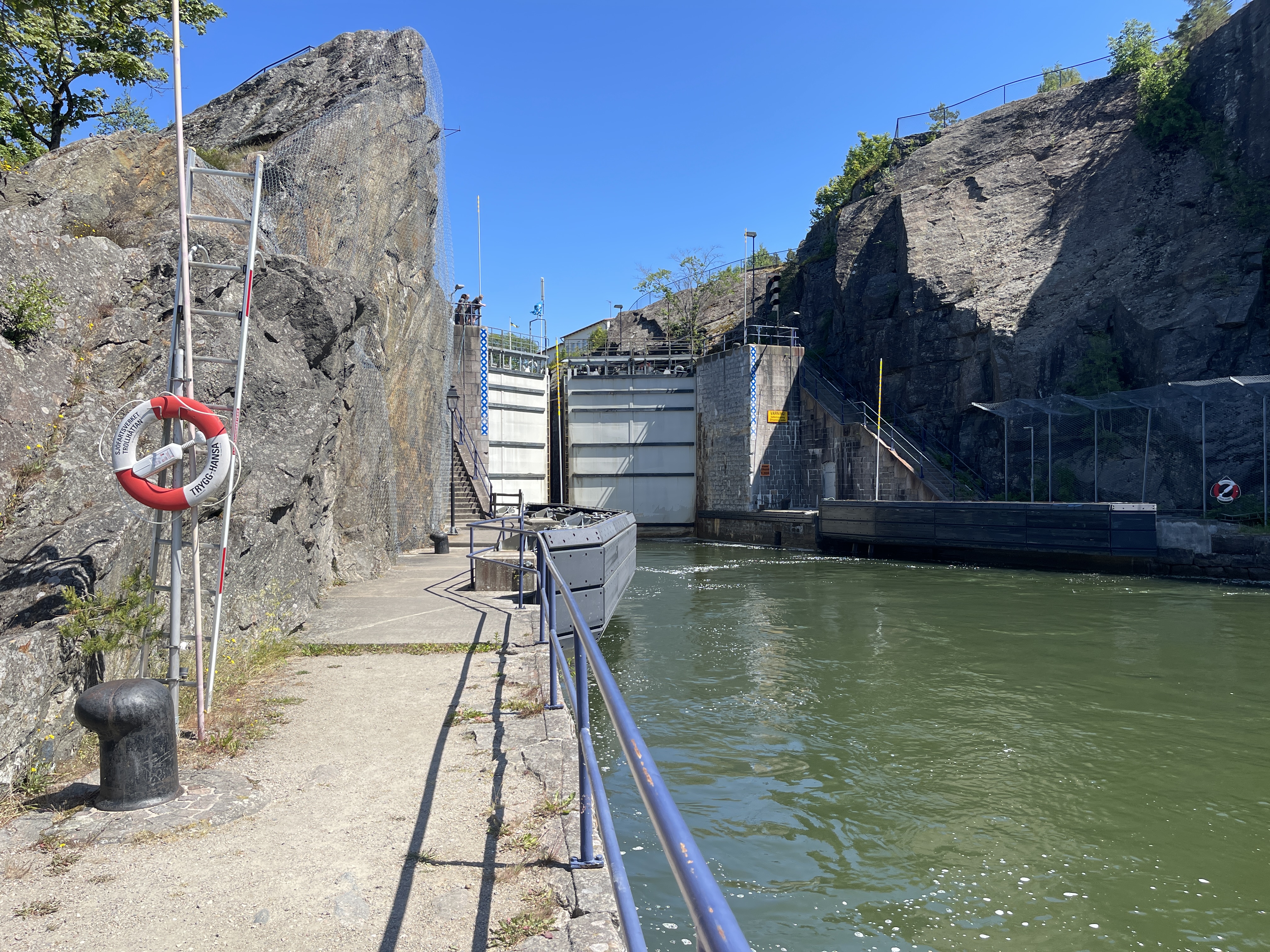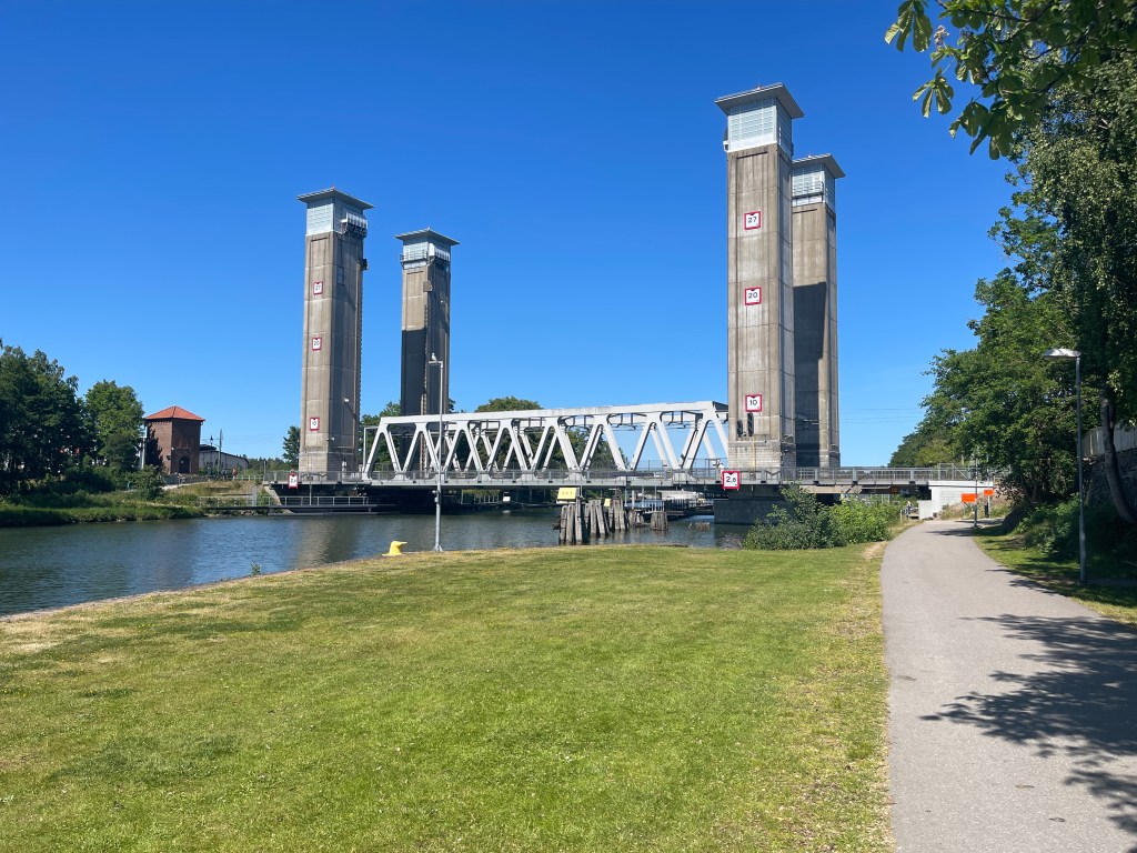 10 juni. Trollhättan. We zijn hier voor het Götakanaal en de sluizen. Hier varen nog grote vrachtschepen. Een vervelende aankomst op deze camperplaats. Je moet hier inchecken met je creditkaart en dan ook uit checken met die kaart. Ik stond al op de CP maar Lia kon er niet in zonder creditkaart. En dit keer kon ik haar niet helpen. Meestal krijg je een parkeerkaart en kan je met je creditkaart twee ticket kopen maar nu betaalde je pas bij vertrek en kon de kaart maar een keer gebruikt worden. Bankpassen worden hier overal geweigerd op CP en op parkeerplaatsen. Lia staat nu vlak in de buurt geparkeerd. We hebben een leuk rondje gefietst langs oude en nieuwe sluizen, uitgezet door de gemeente. De hoogteverschillen zijn hier groot. Dat hier grote schepen passeren blijkt wel uit de foto met de vier palen die kunnen de brug voor grote schepen omhoog halen.