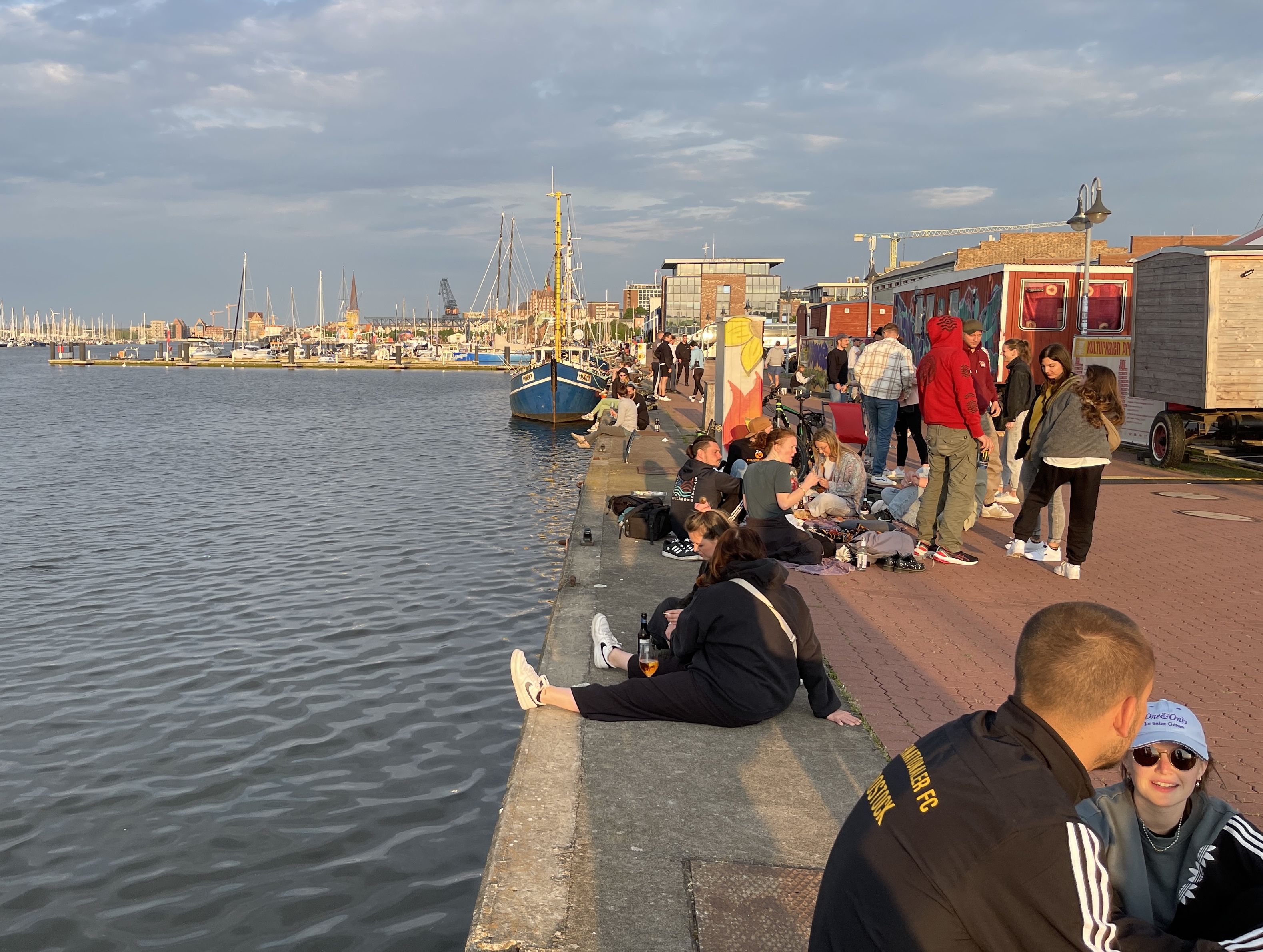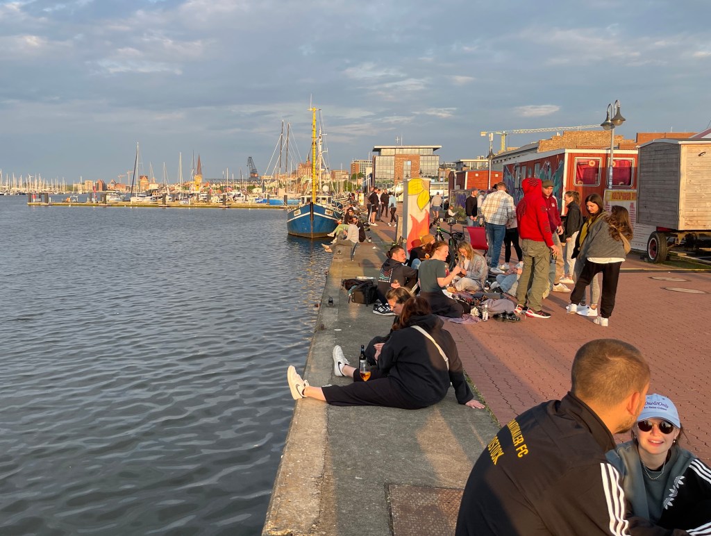 14 mei naar Rostock. We vonden zowaar alle drie een plek aan de kade in het centrum van Rostock (58366). Betalen hoefden we ook niet, op zondag vrij parkeren. Dat betekende wel om acht bij de automaat staan de volgende dag om voor maandag nog tot vertrek te betalen. En ja hoor, om tien over acht kwam de controle. Leuke wandeling gemaakt door de stad, eerste en zeker niet het laatste ijsje gegeten, eerste en enige bui op de kop. In Rostock staan overal elektrische steps die je zo kan meenemen. ’s Avonds heel gezellig langs de kade. Jongelui komen er met hun eigen drankjes en eten en genieten van de avondzon. Om een uur of elf naar de ferryhaven gereden voor de boot naar Trellenborg. Zes uur varen. We hadden vooruit een camping geboekt omdat we wisten pas om een uur of half tien zouden aankomen. Was al behoorlijk donker bij aankomst en de code voor de barrière die we per mail kregen, werkte niet. In het donker zoeken naar een ingang en toen nog zoeken naar het toegewezen plekje. Behoorlijk lastig. Half elf aan een wijntje en het kon nog buiten.